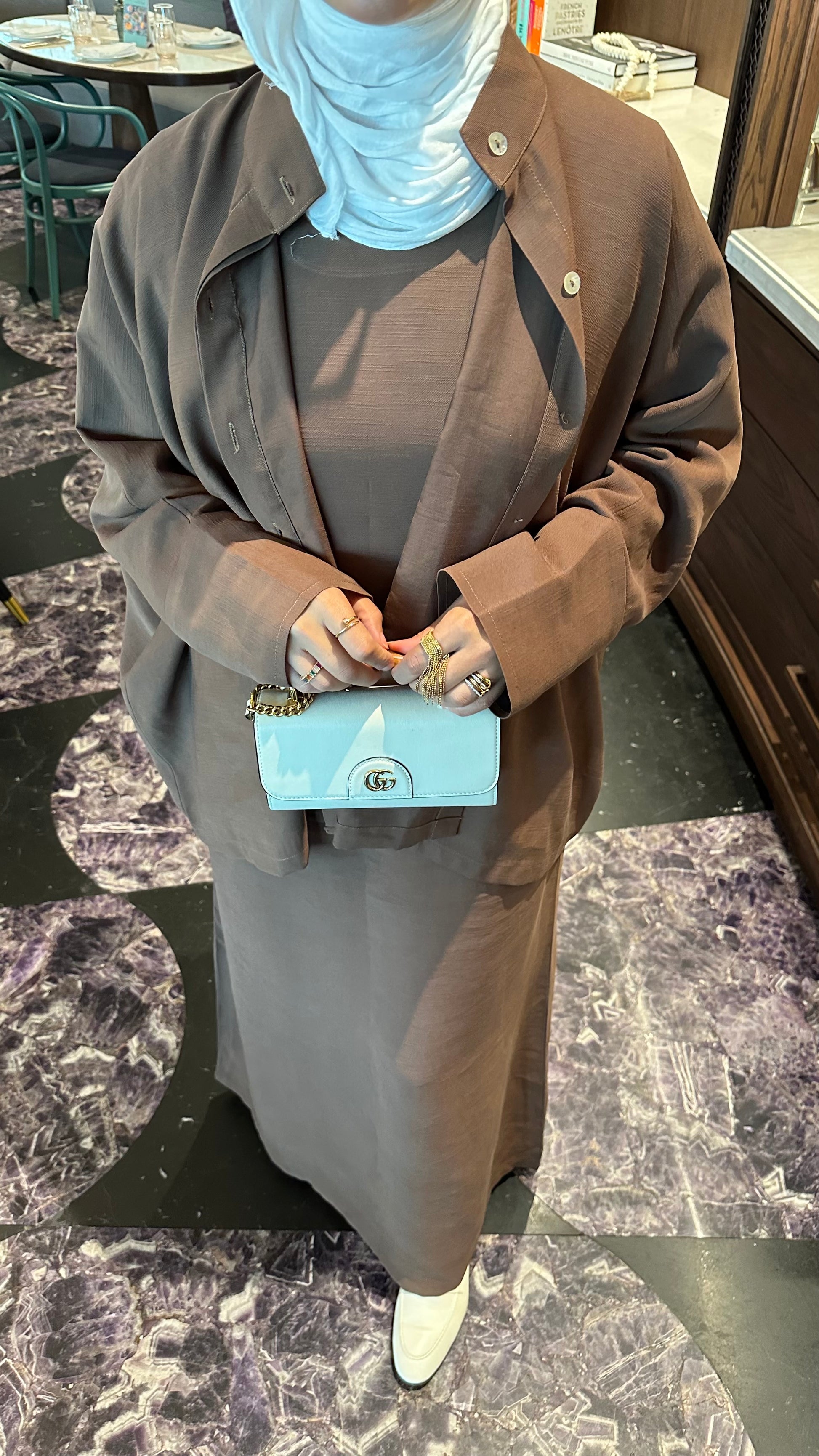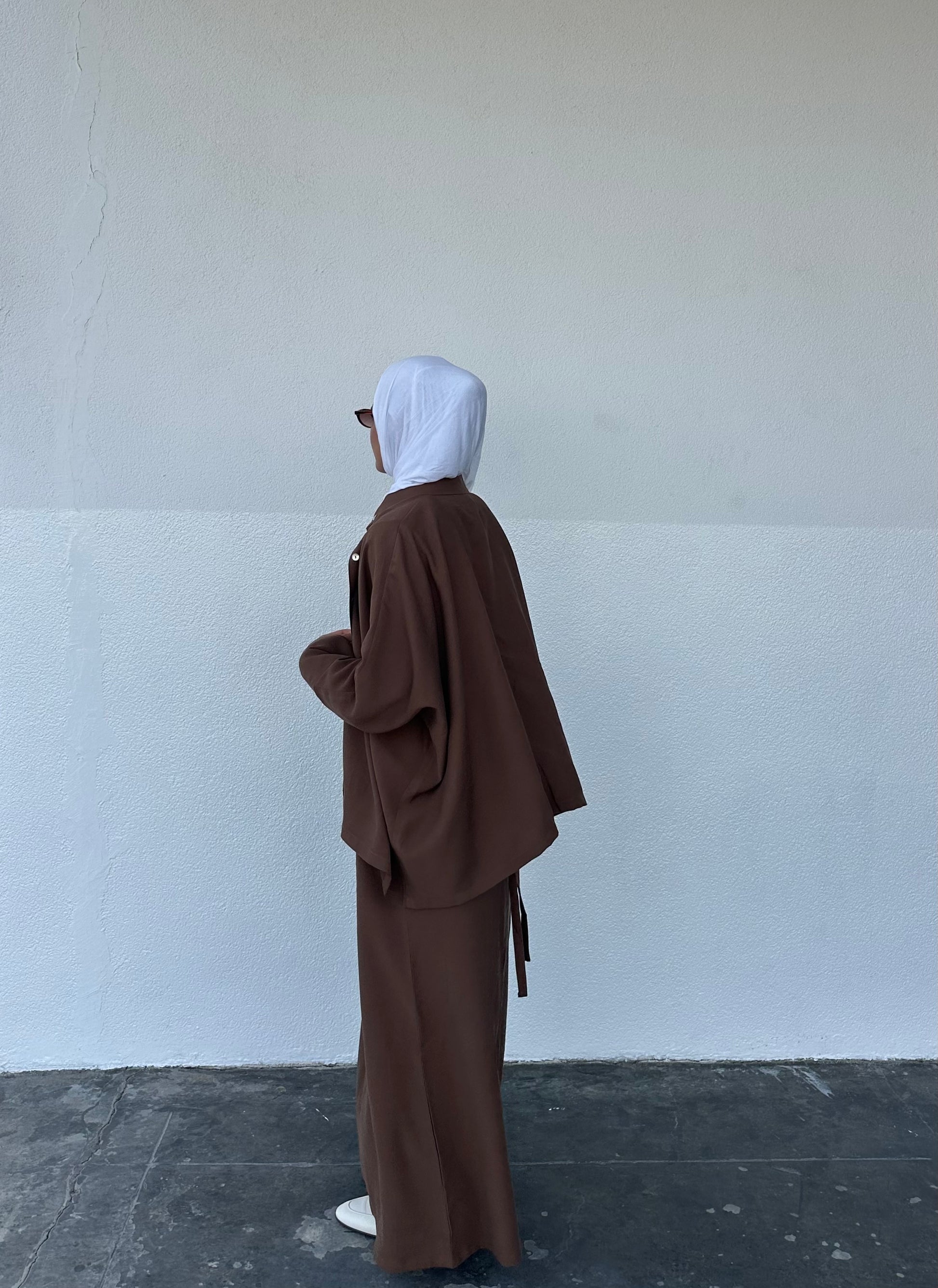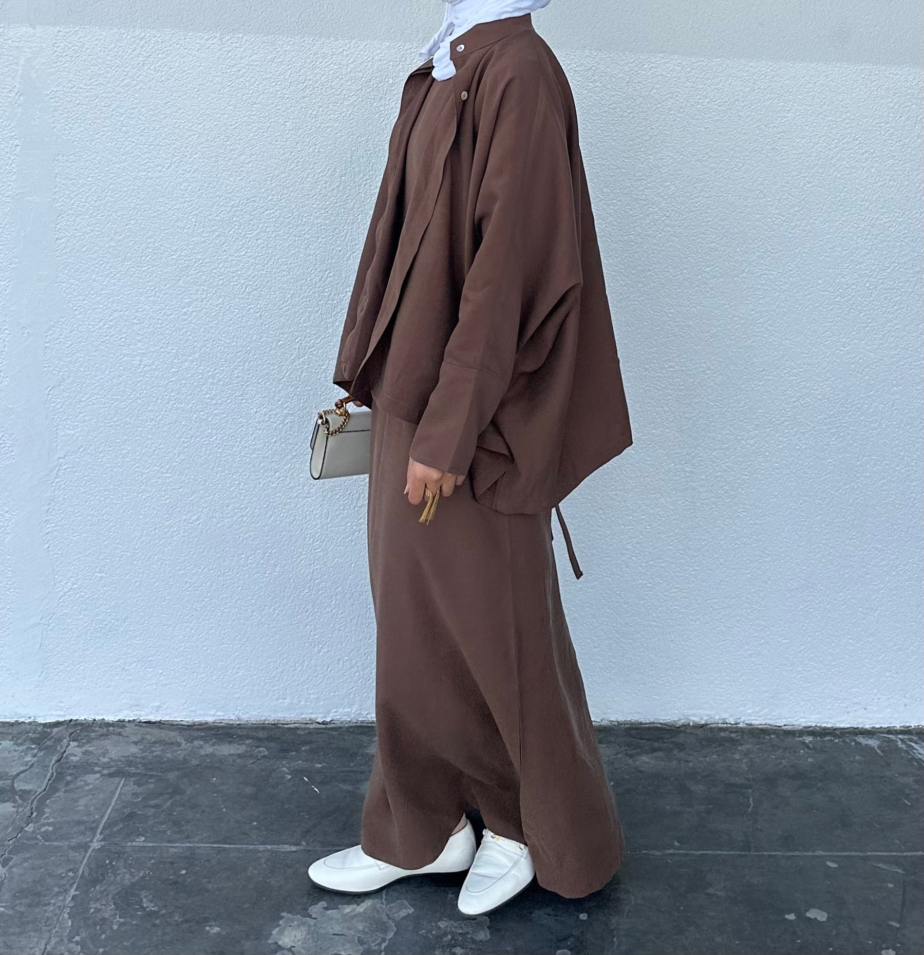 A muted lilac two-piece set featuring a flowy full-length dress with side tie detail and a relaxed overlay jacket with pearly buttons. Elevated, effortless, and made to suit every occasion.