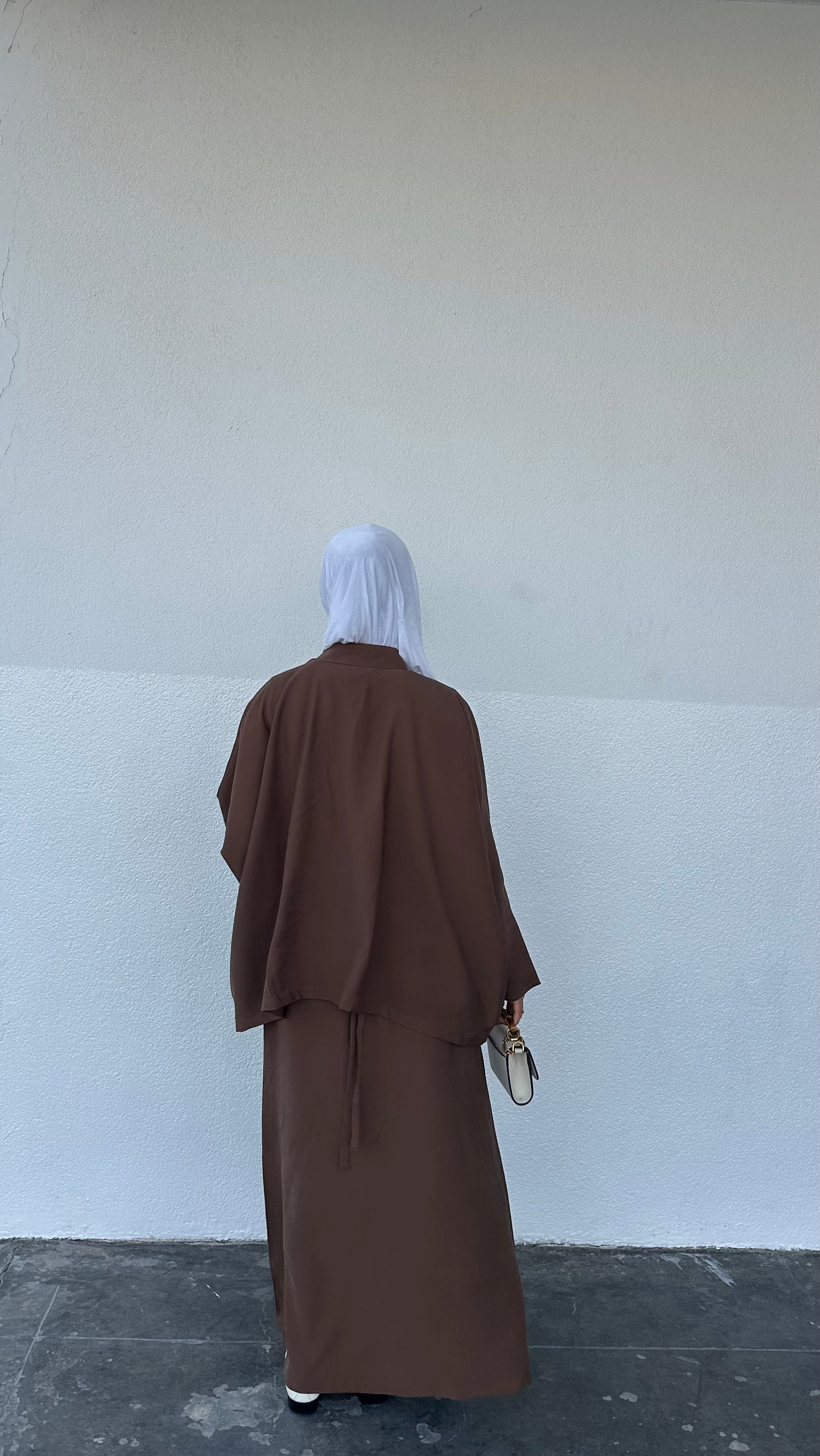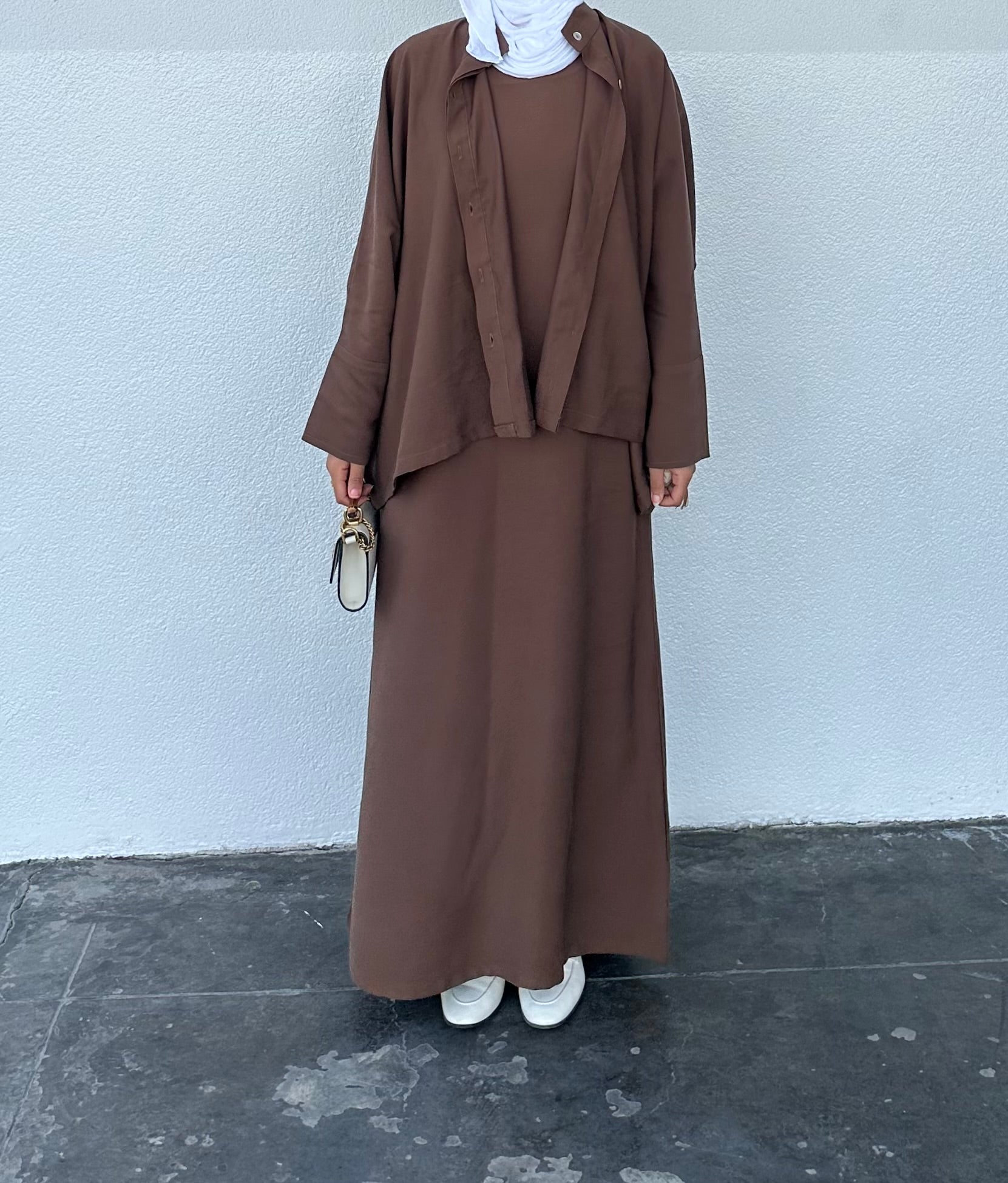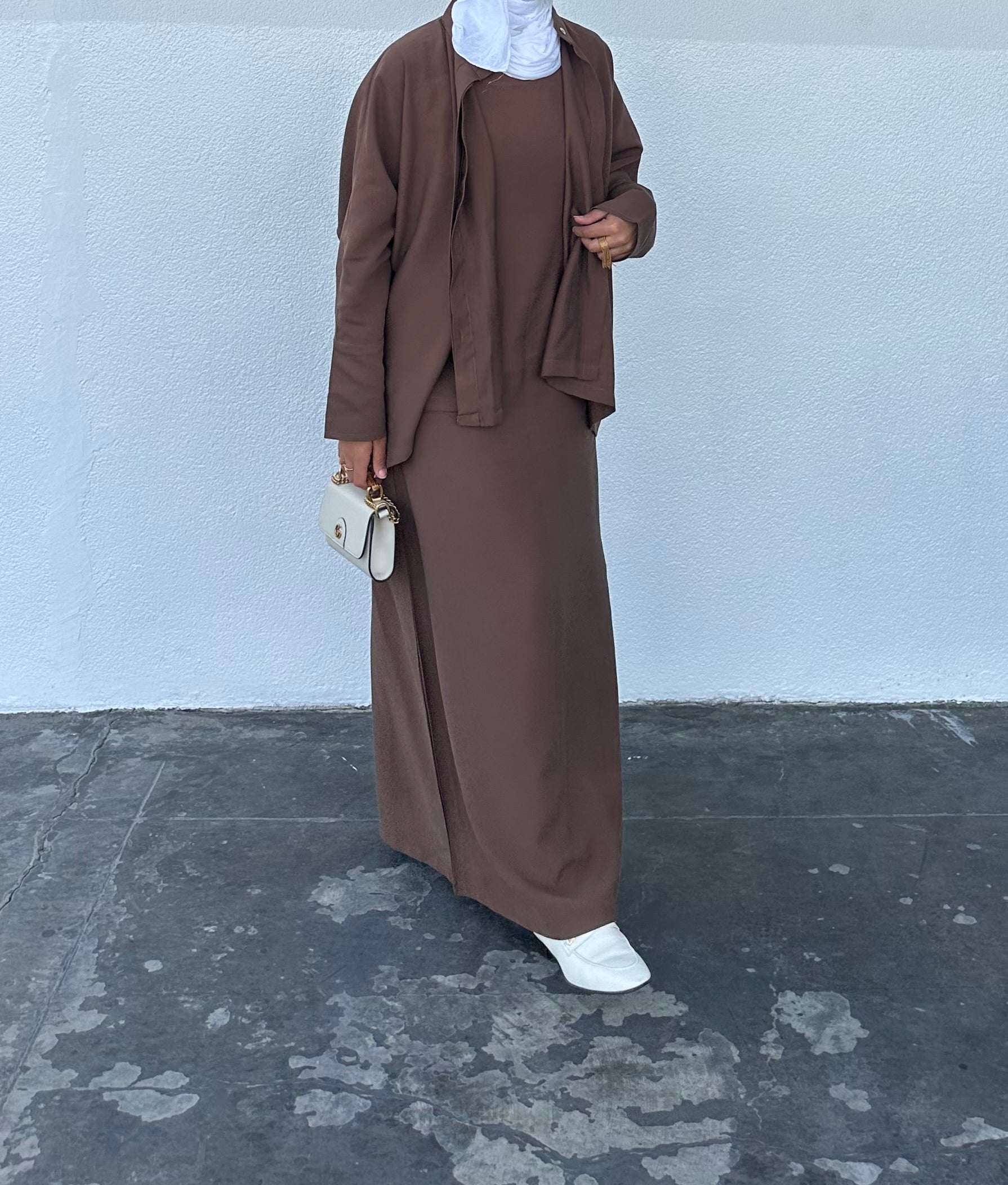 A muted lilac two-piece set featuring a flowy full-length dress with side tie detail and a relaxed overlay jacket with pearly buttons. Elevated, effortless, and made to suit every occasion.