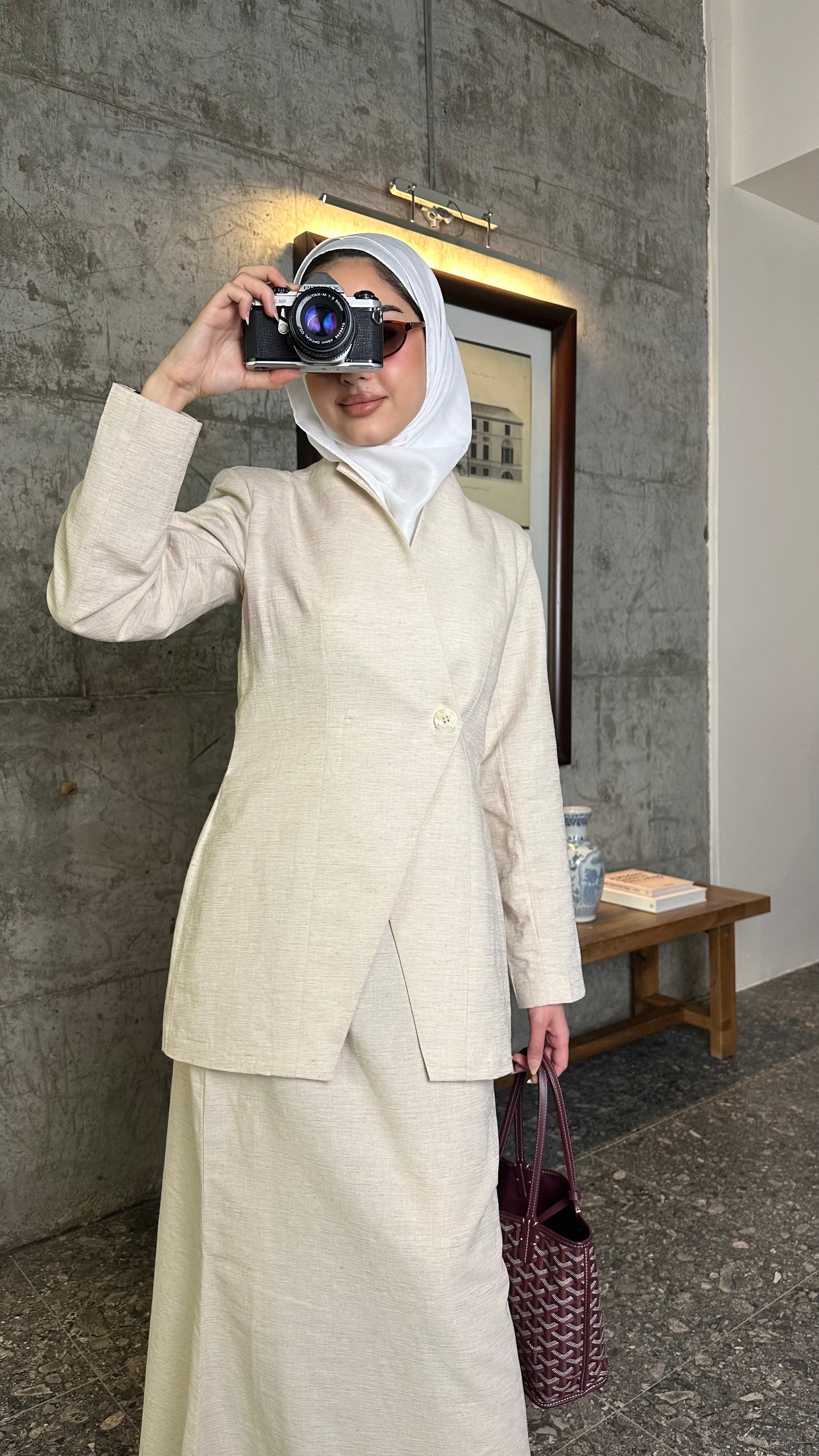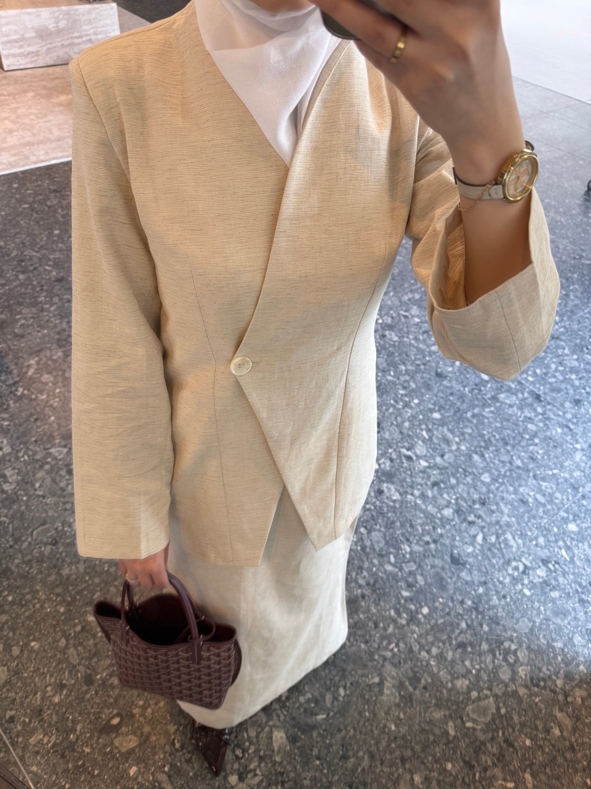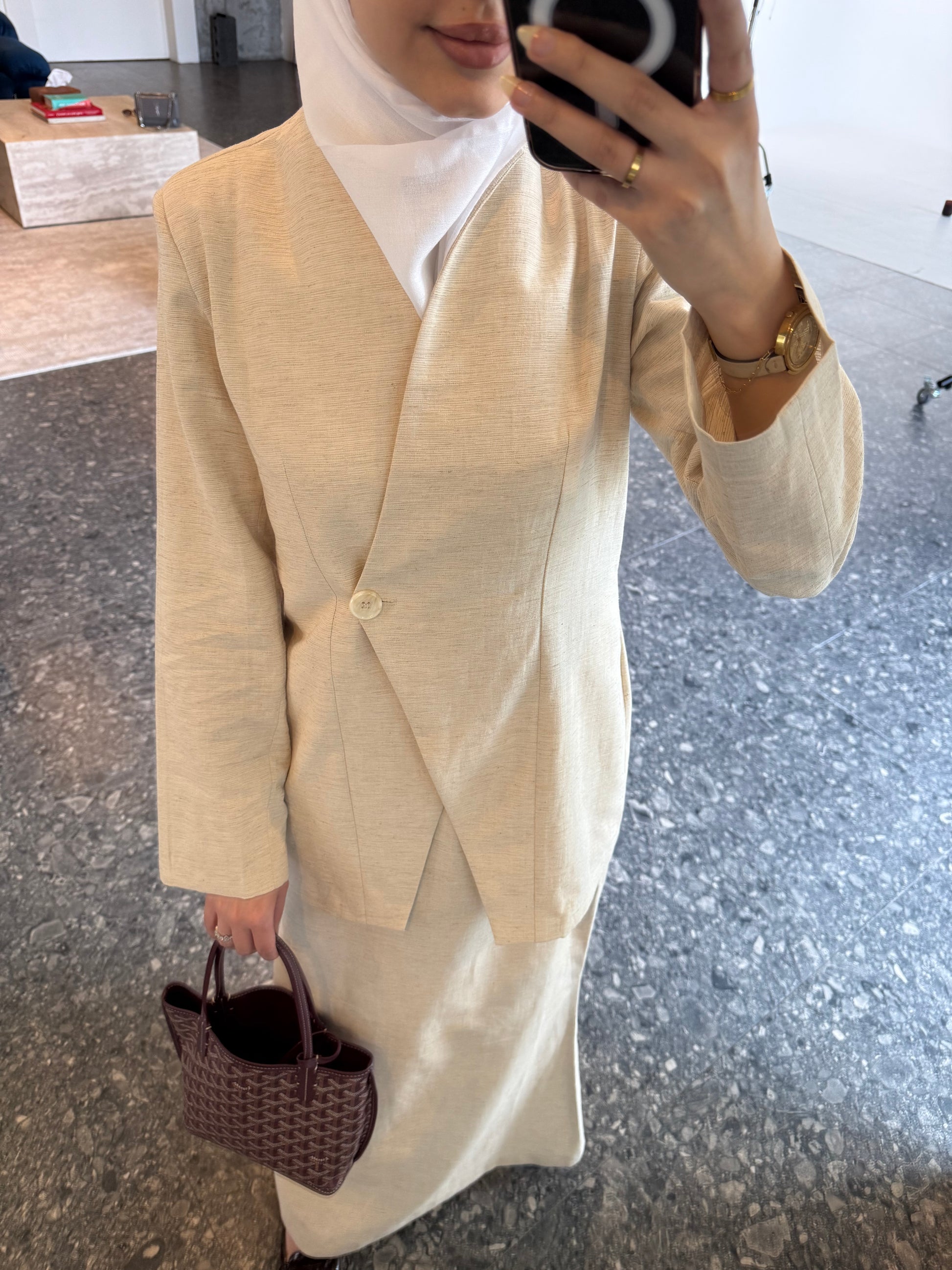 Fitted long sleeve blazer with side button, paired with a flared skirt.