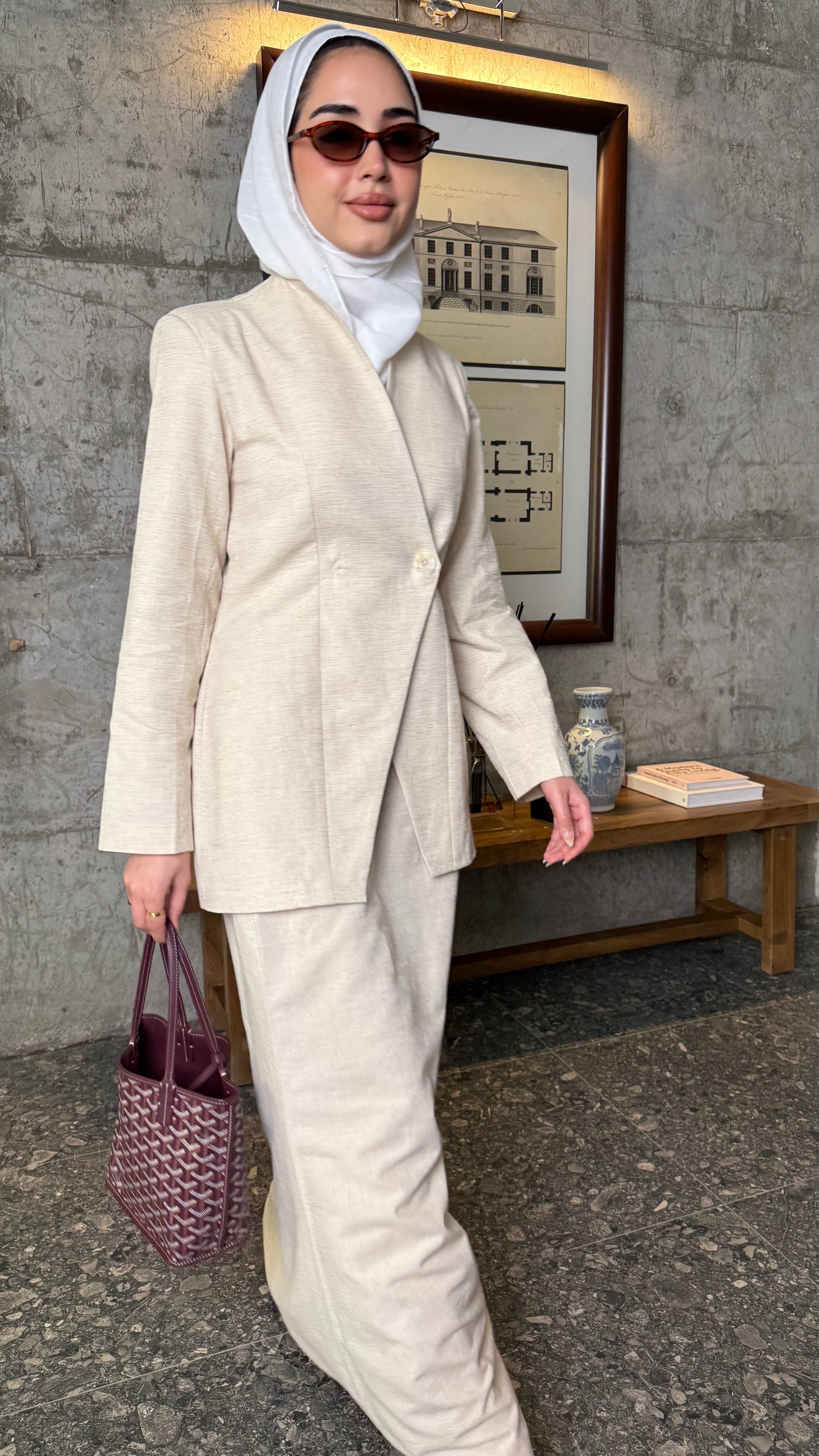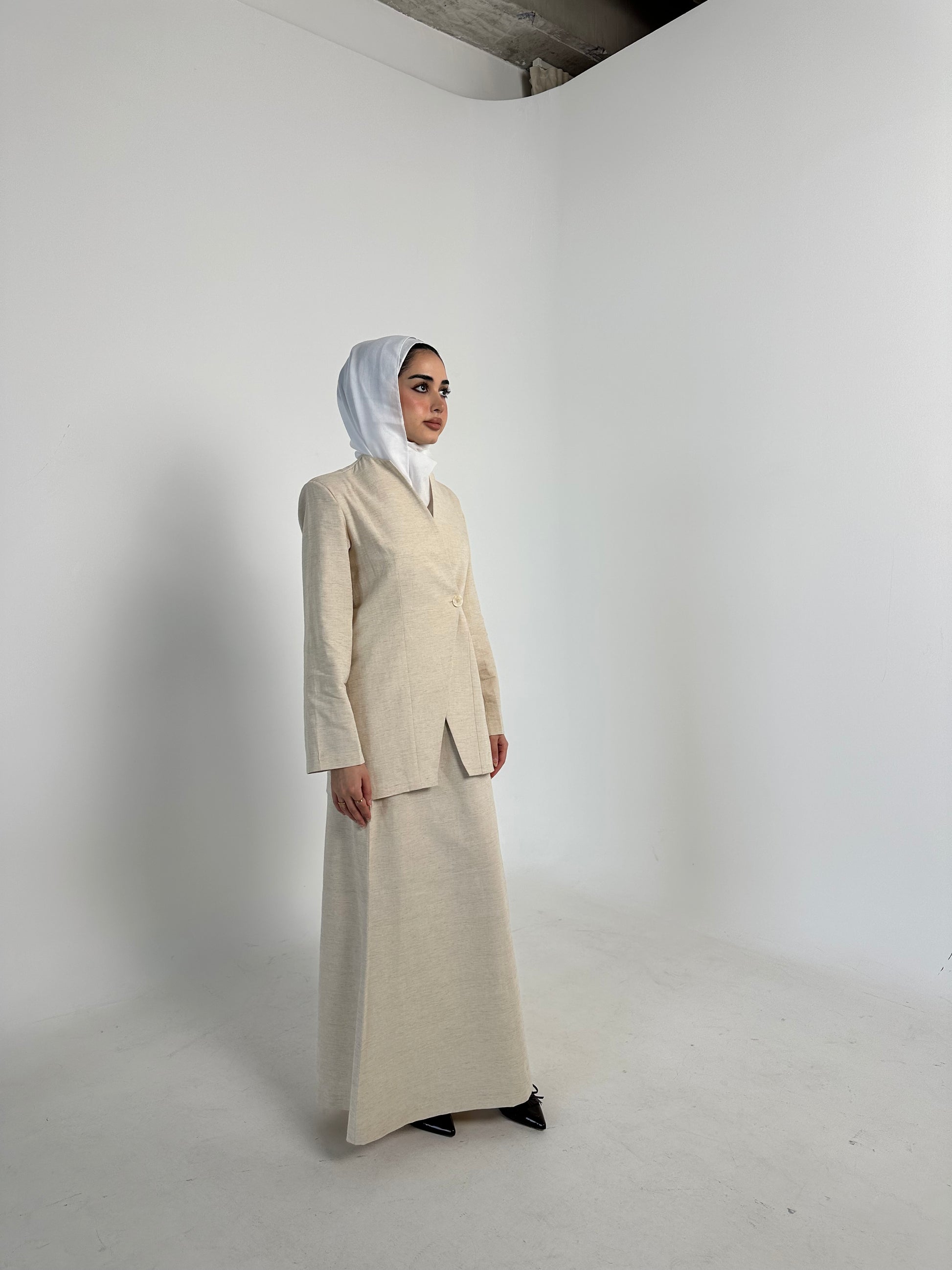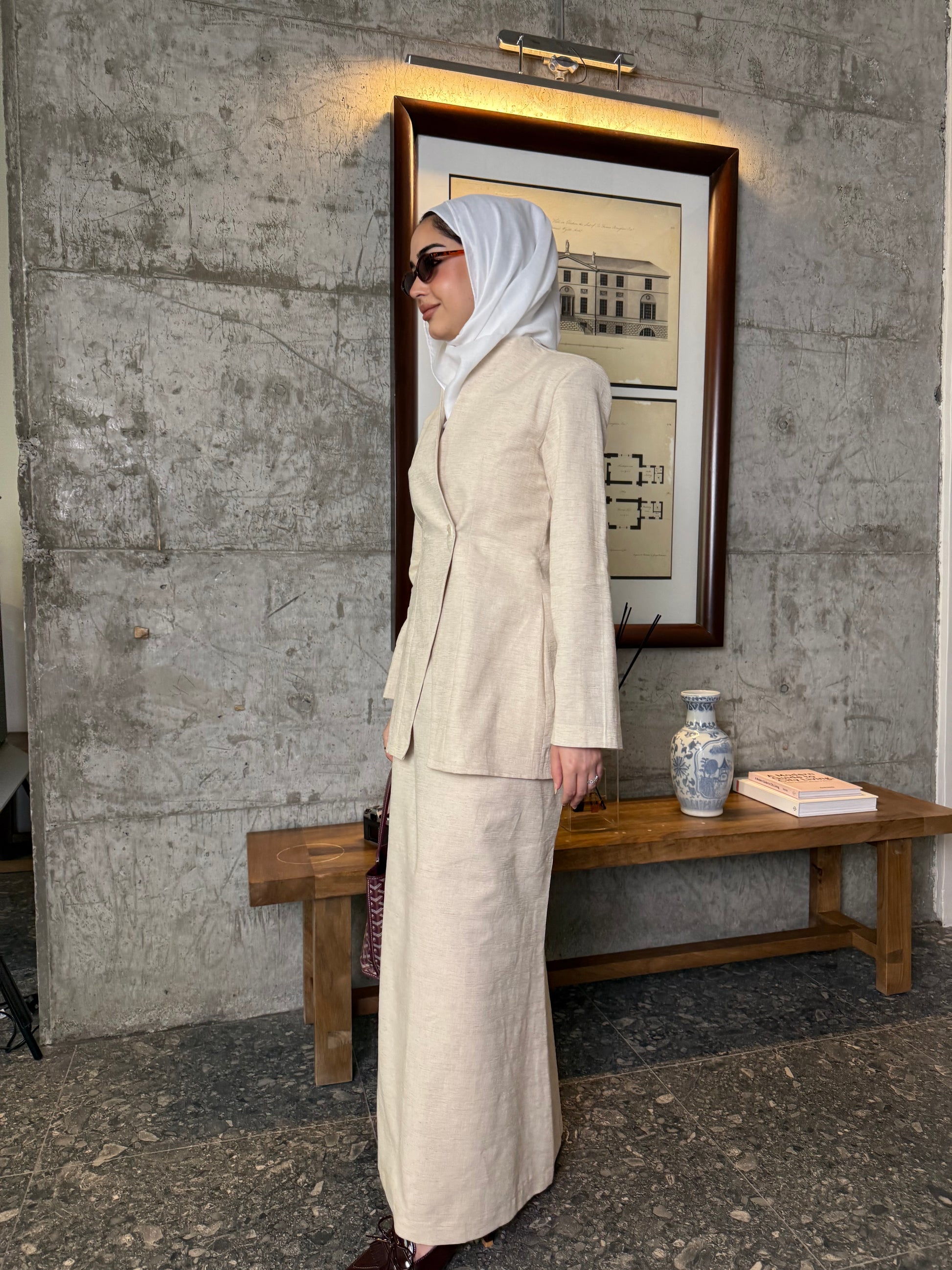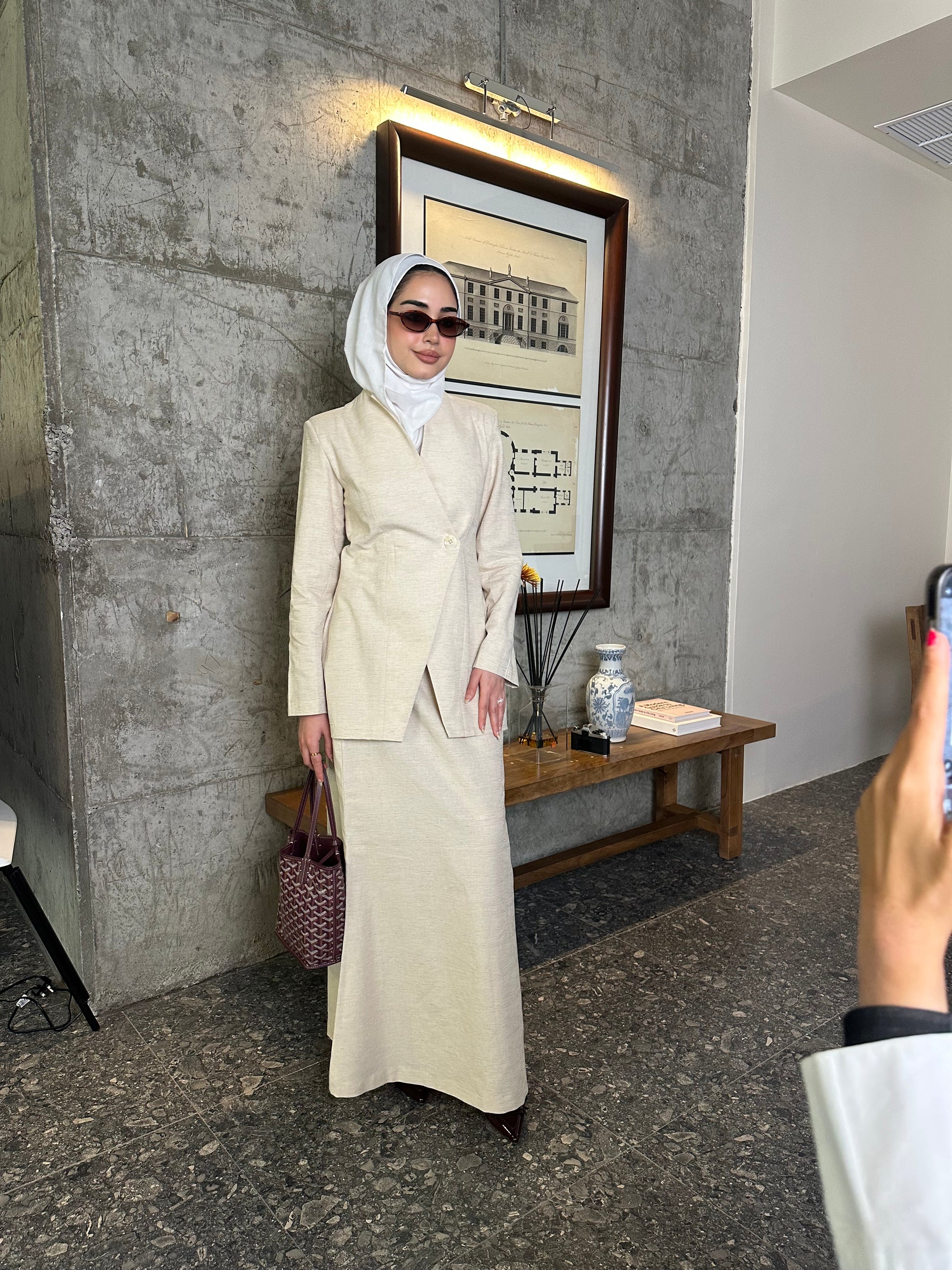 Fitted long sleeve blazer with side button, paired with a flared skirt.