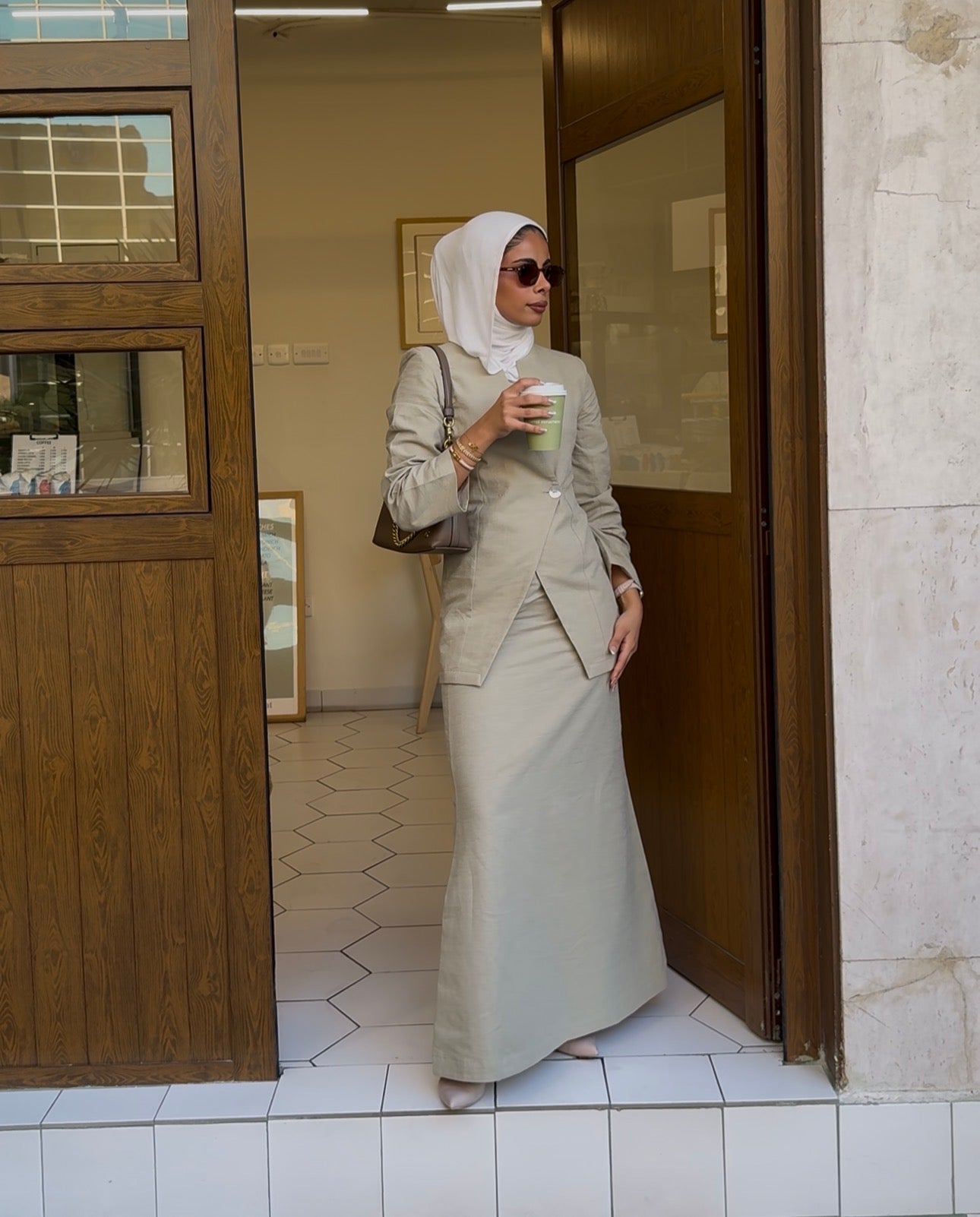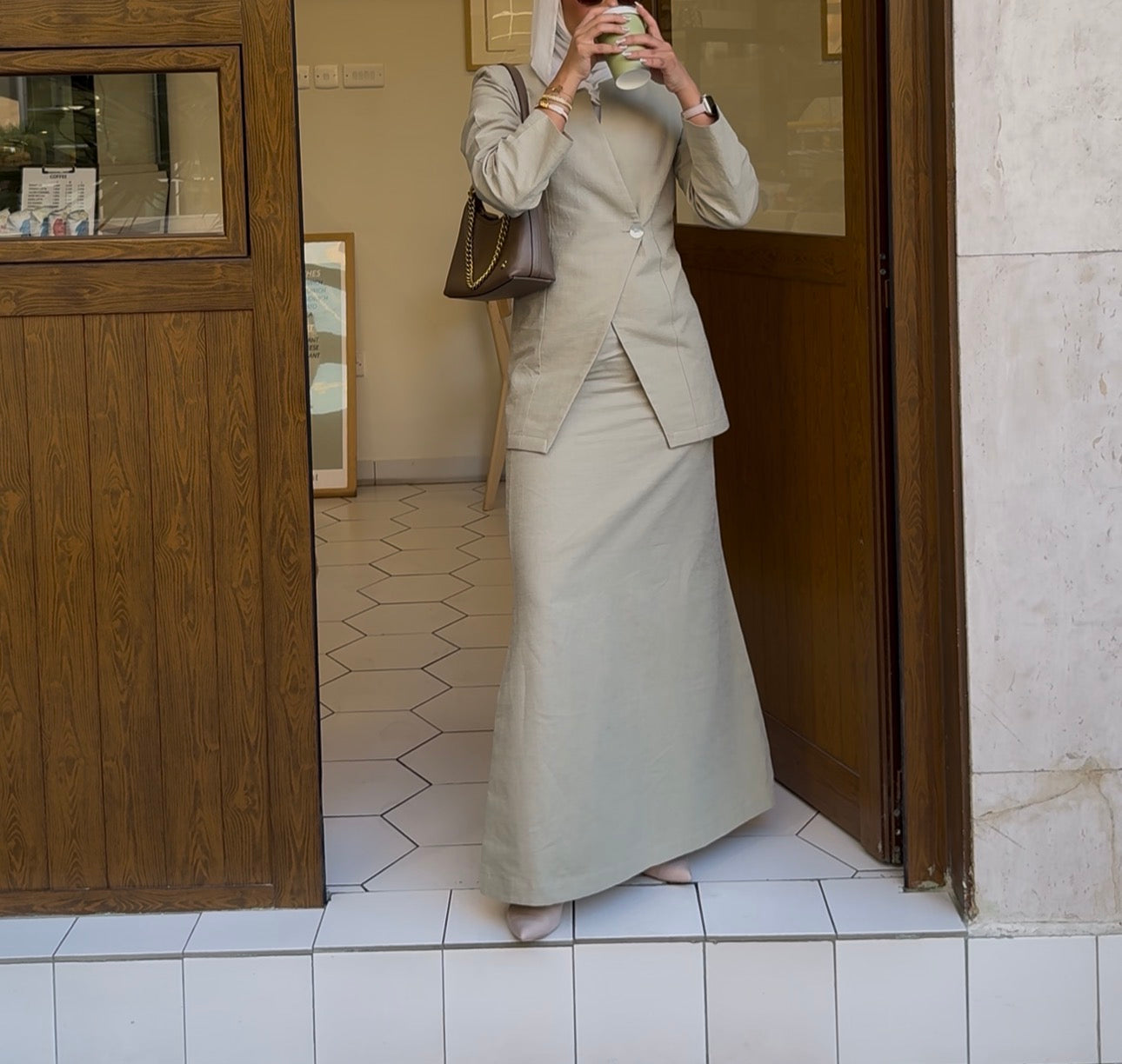 Fitted long sleeve blazer with side button, paired with a flared skirt.