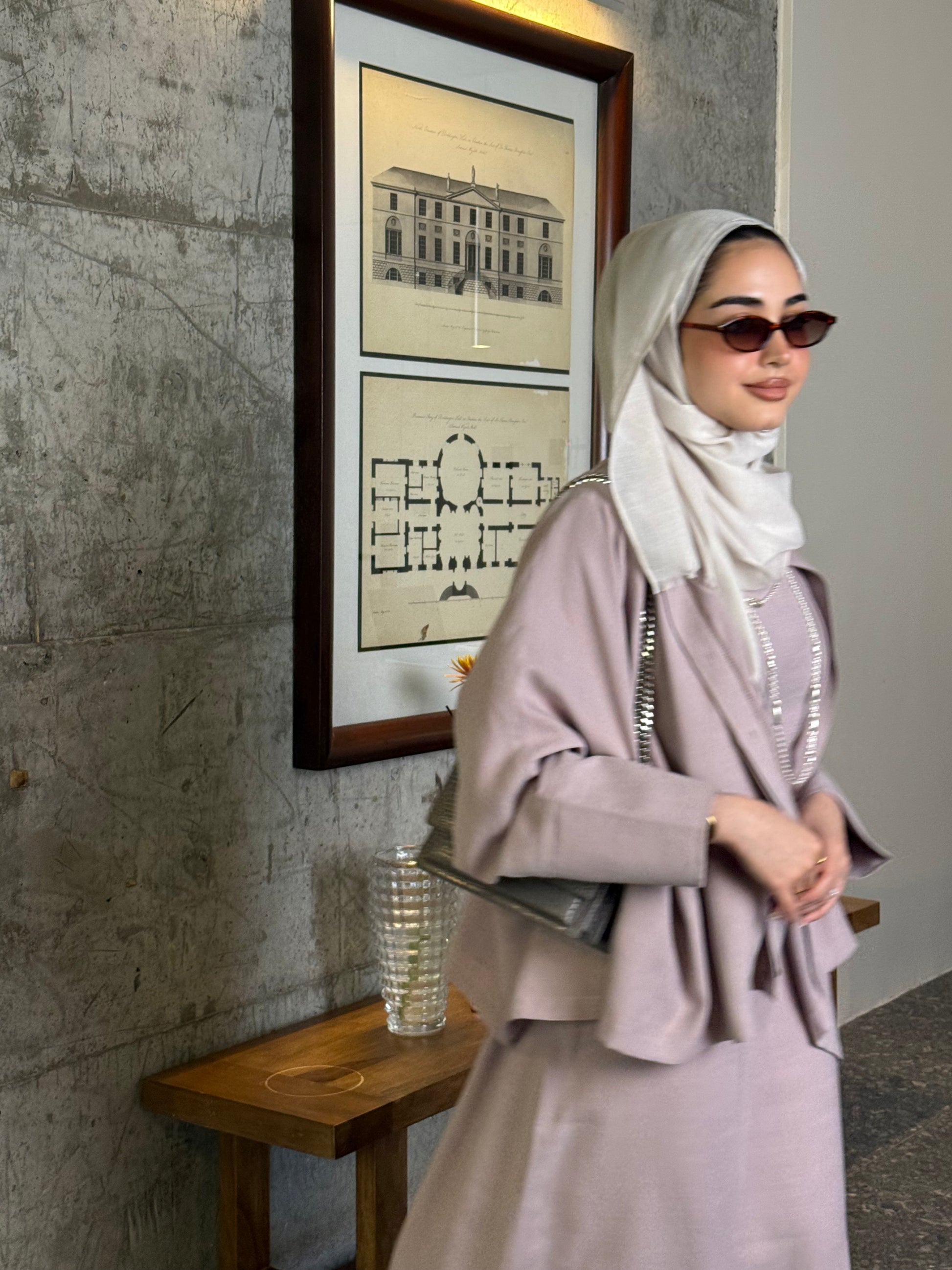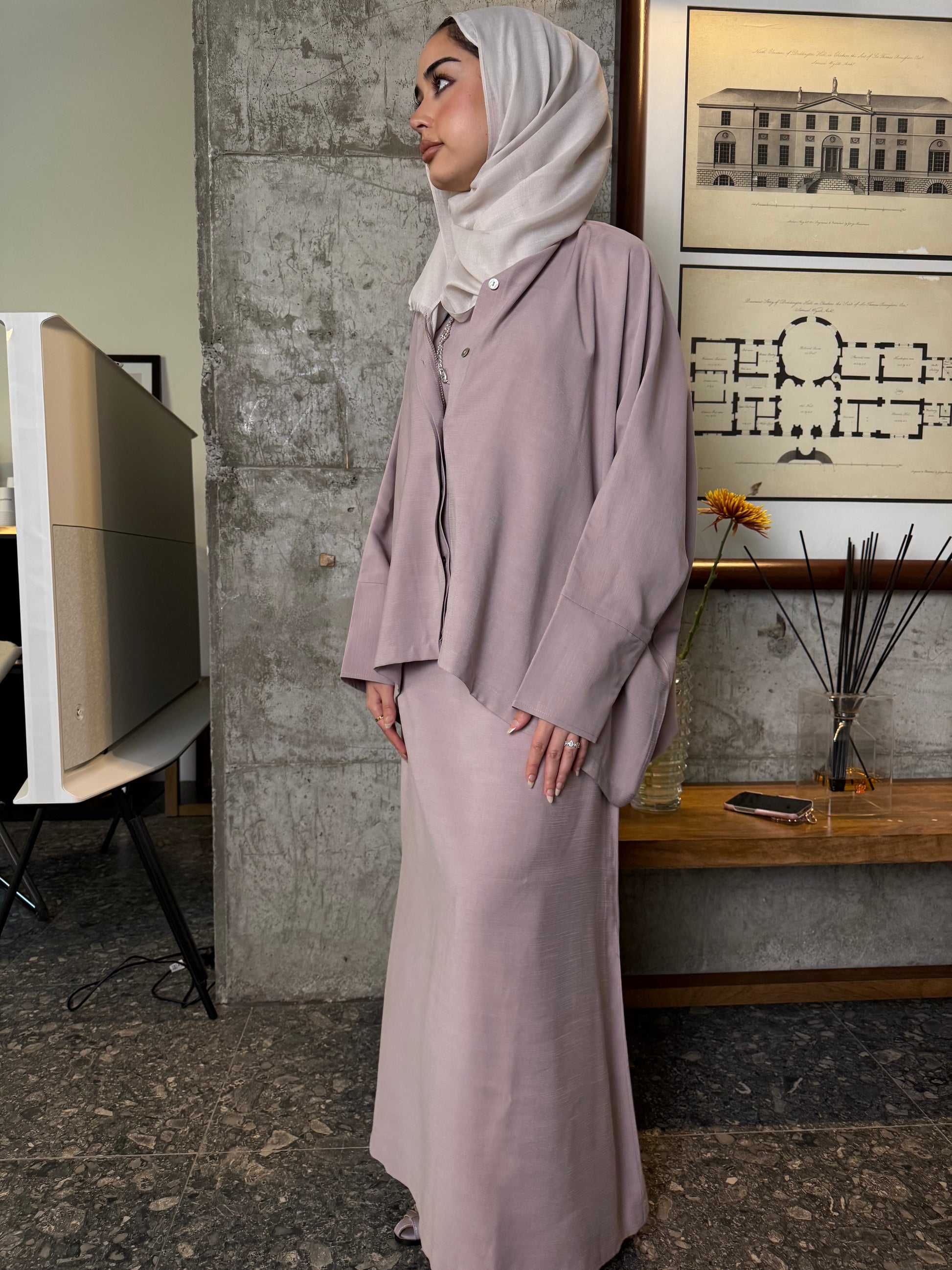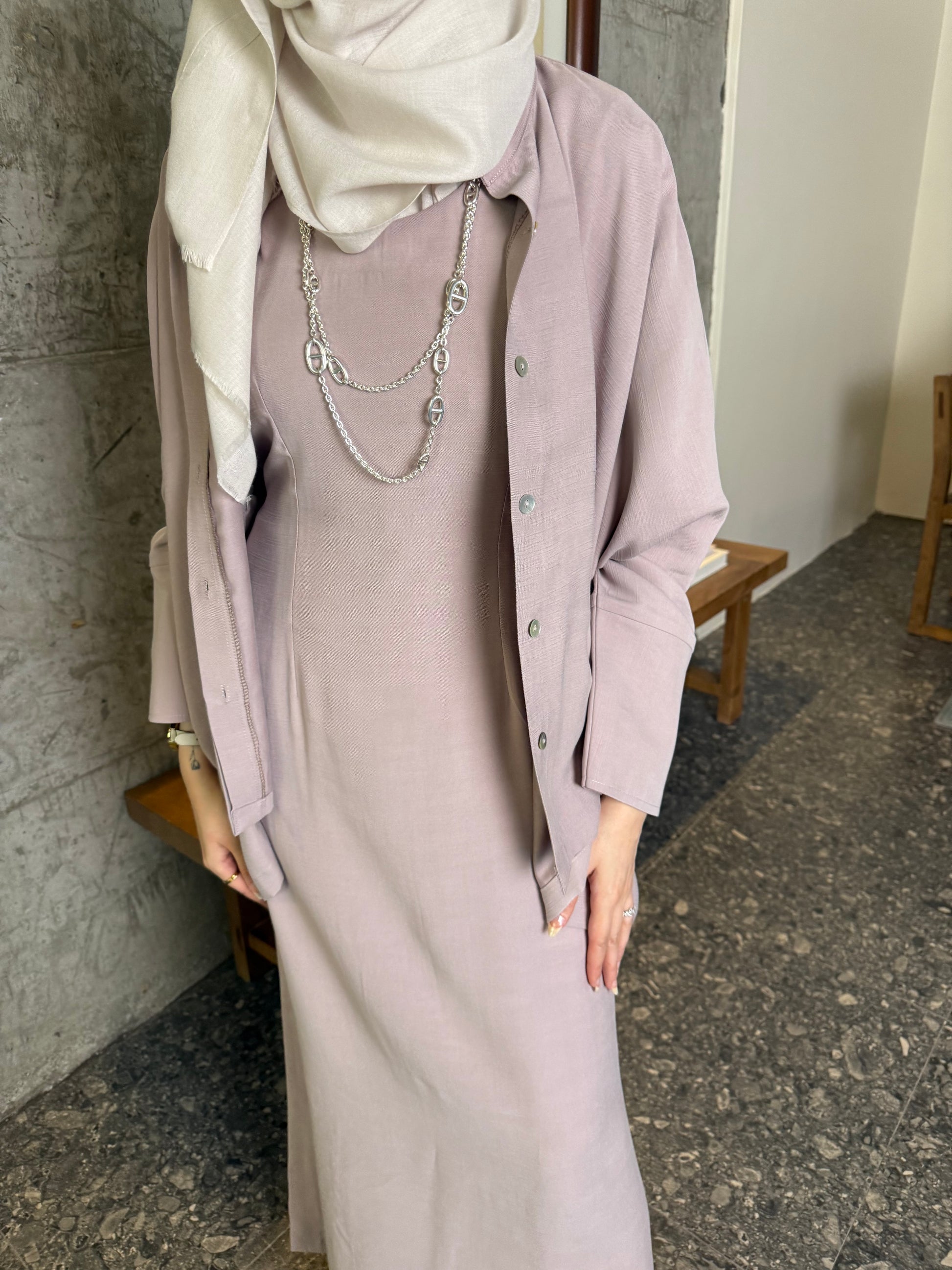 A muted lilac two-piece set featuring a flowy full-length dress with side tie detail and a relaxed overlay jacket with pearly buttons. Elevated, effortless, and made to suit every occasion.