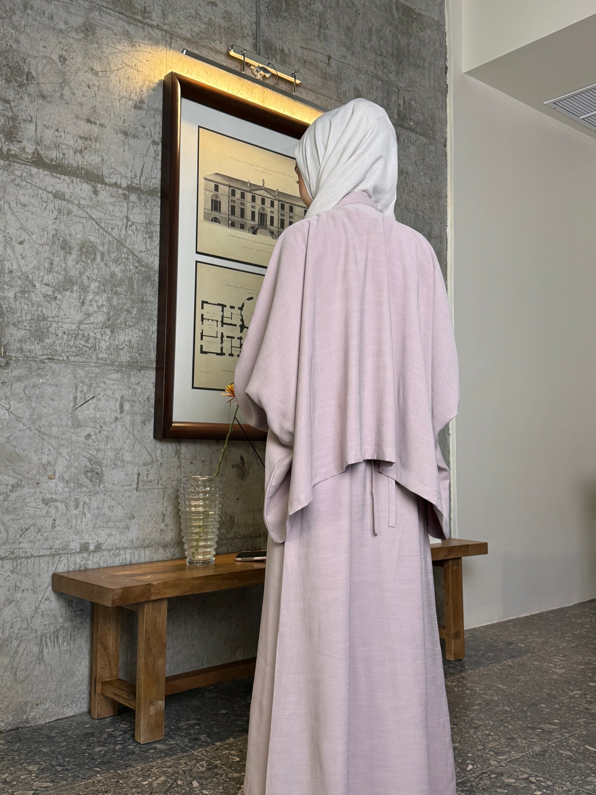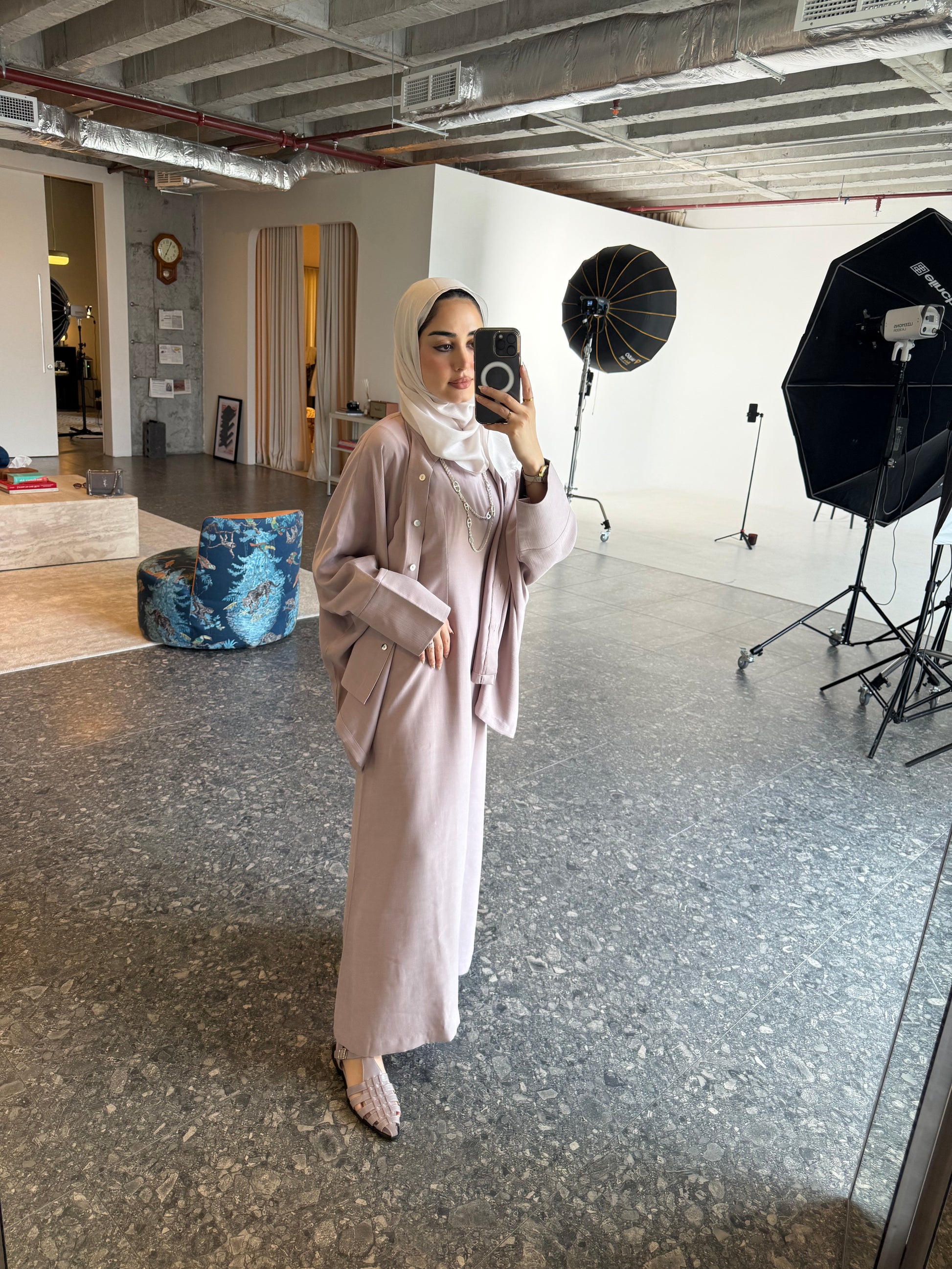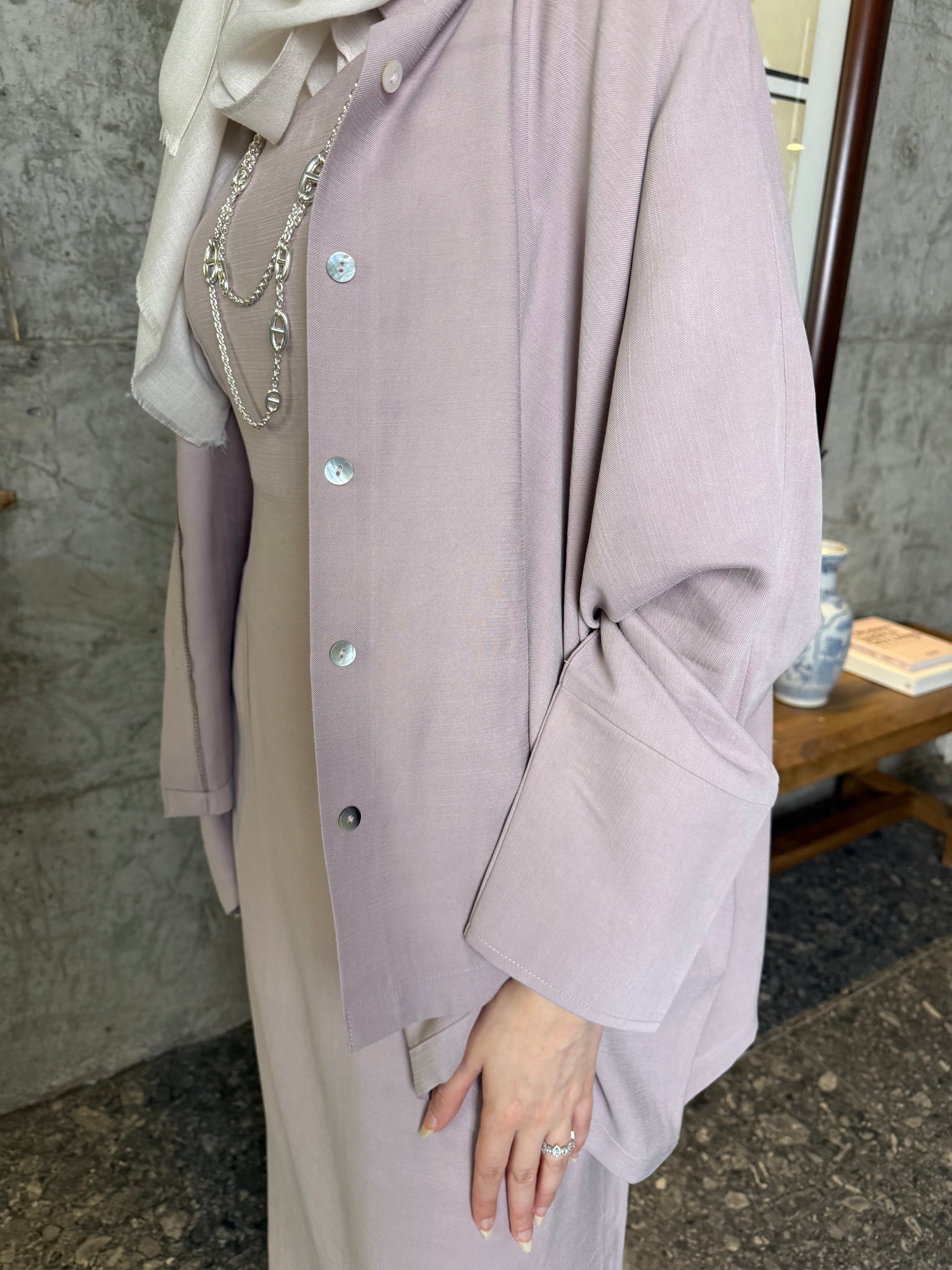 A muted lilac two-piece set featuring a flowy full-length dress with side tie detail and a relaxed overlay jacket with pearly buttons. Elevated, effortless, and made to suit every occasion.