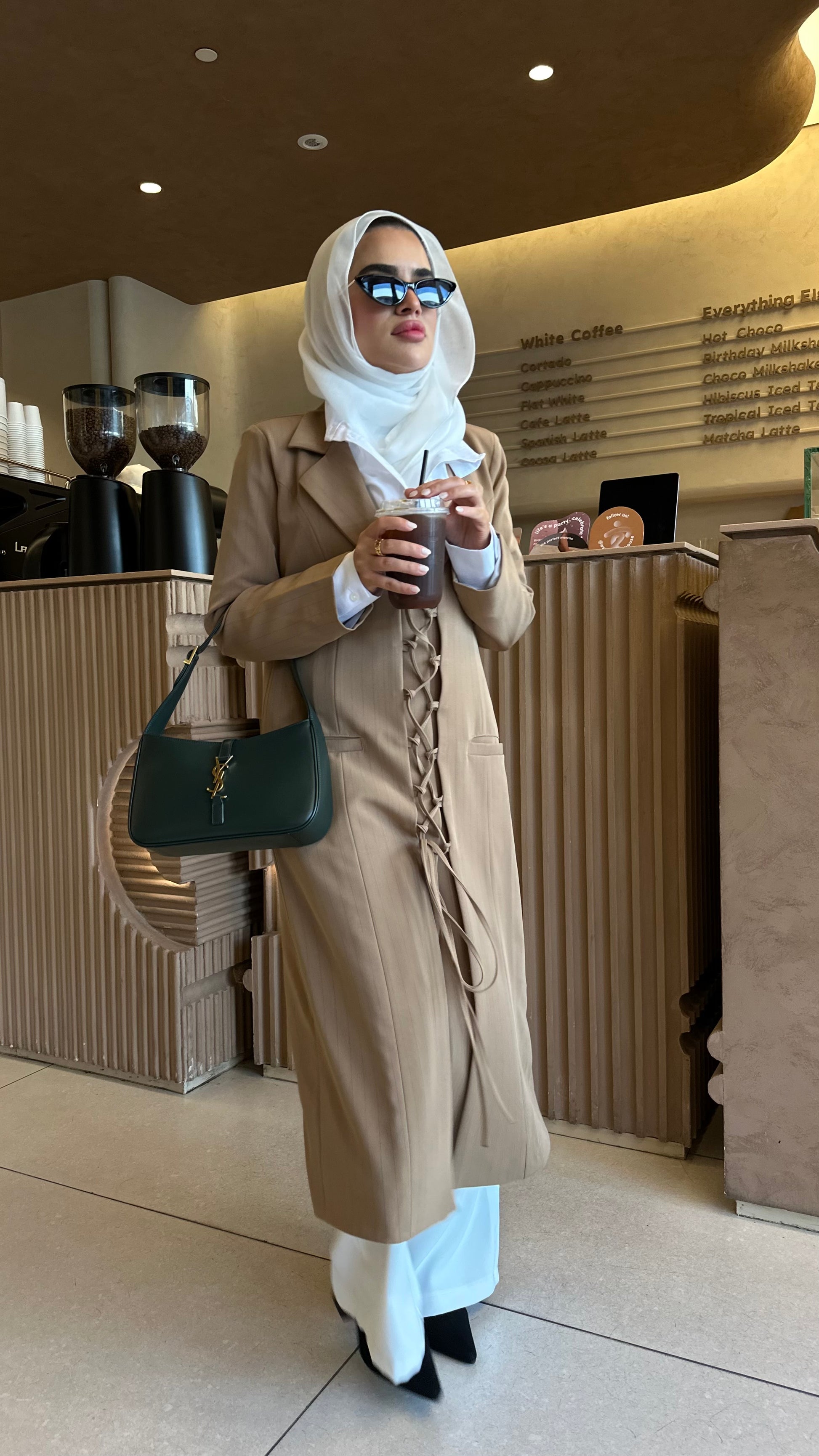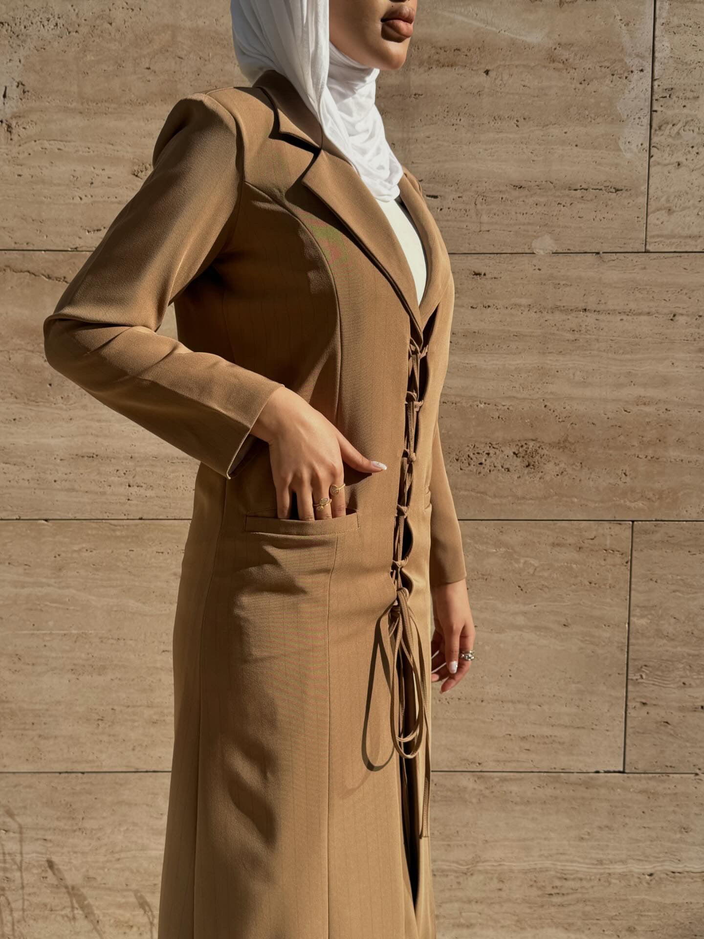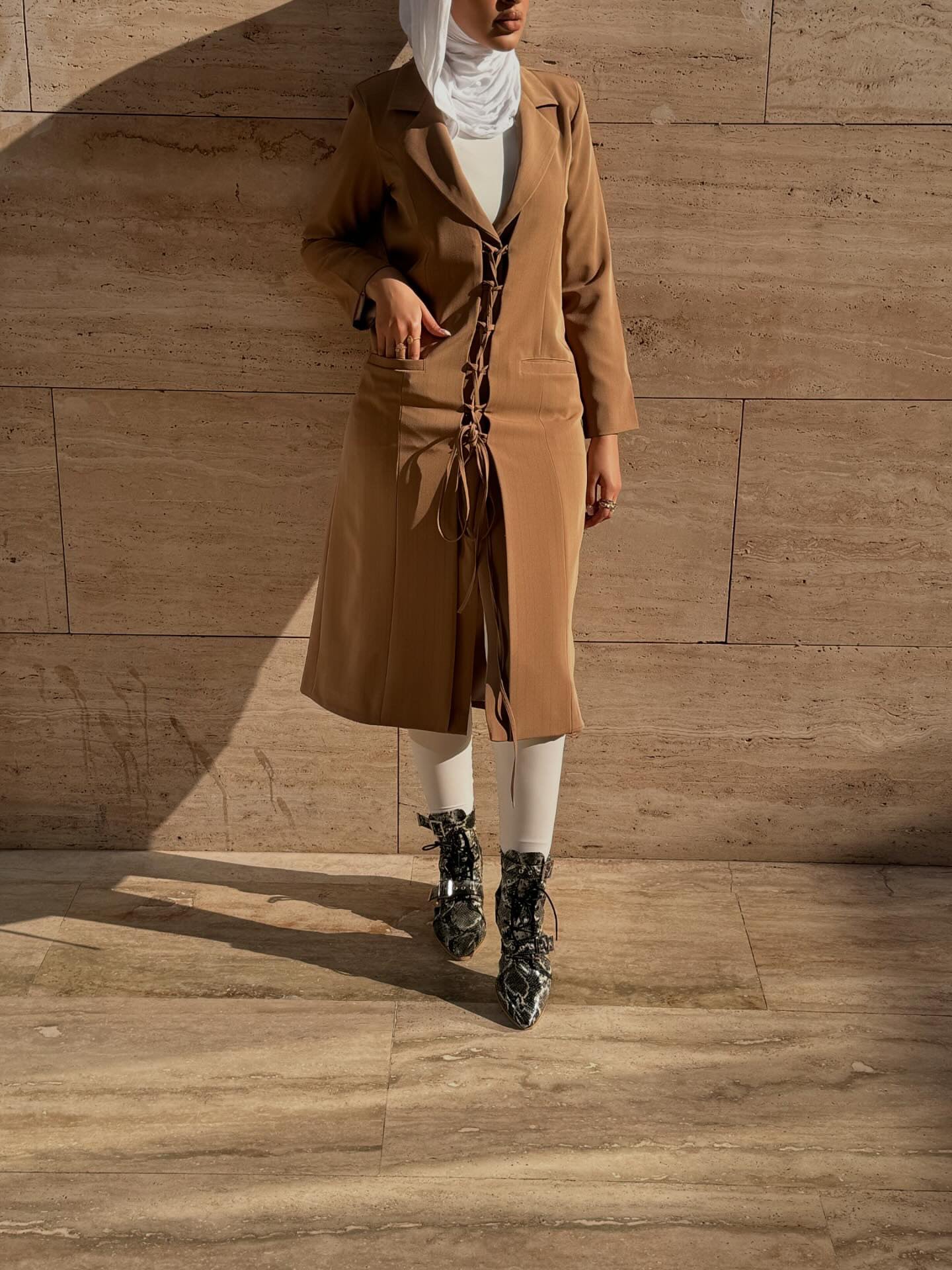 A long, fully lined coat with statement lace-up detailing. Tailored for structure and style. Length: 48 inches.