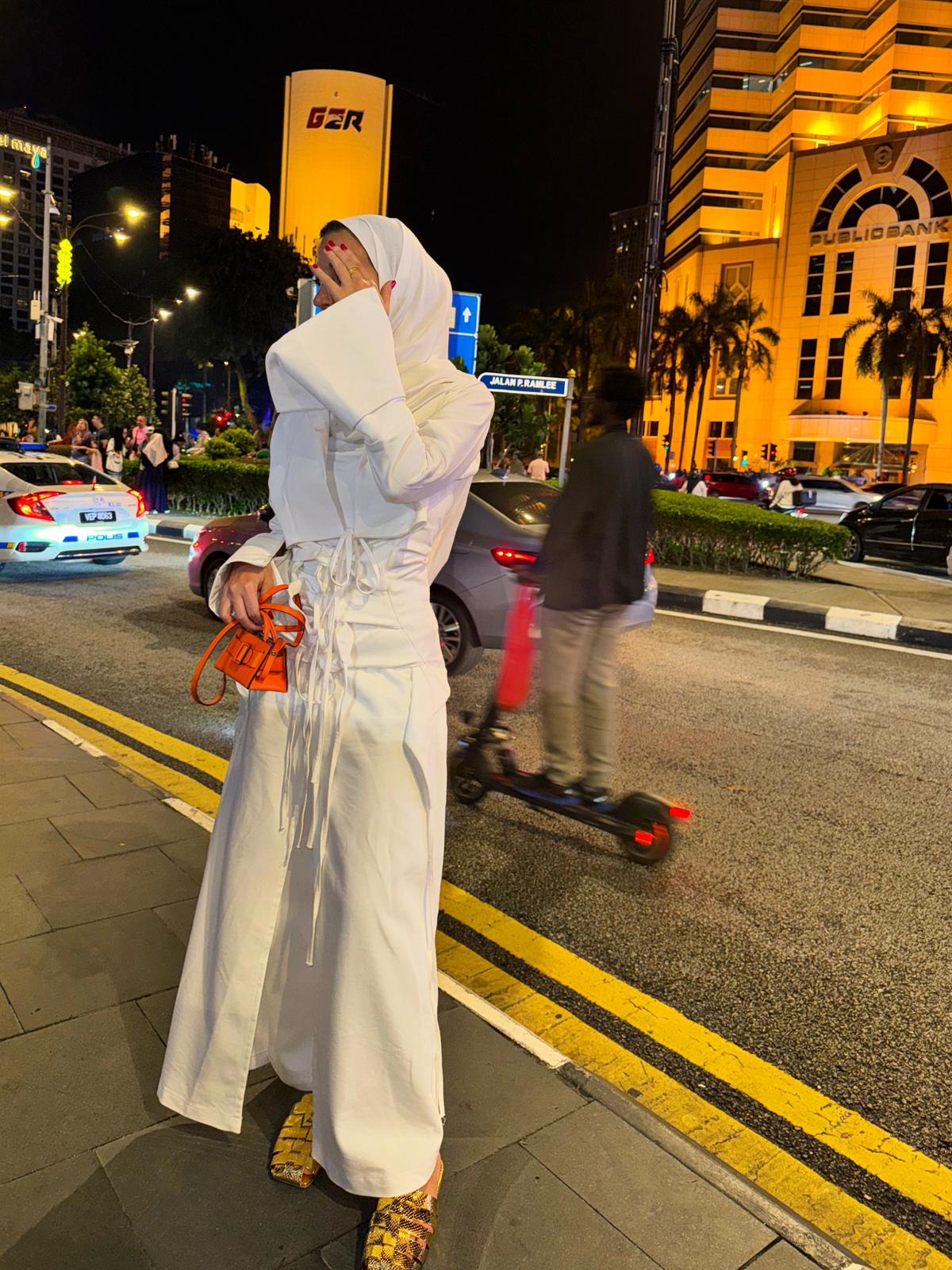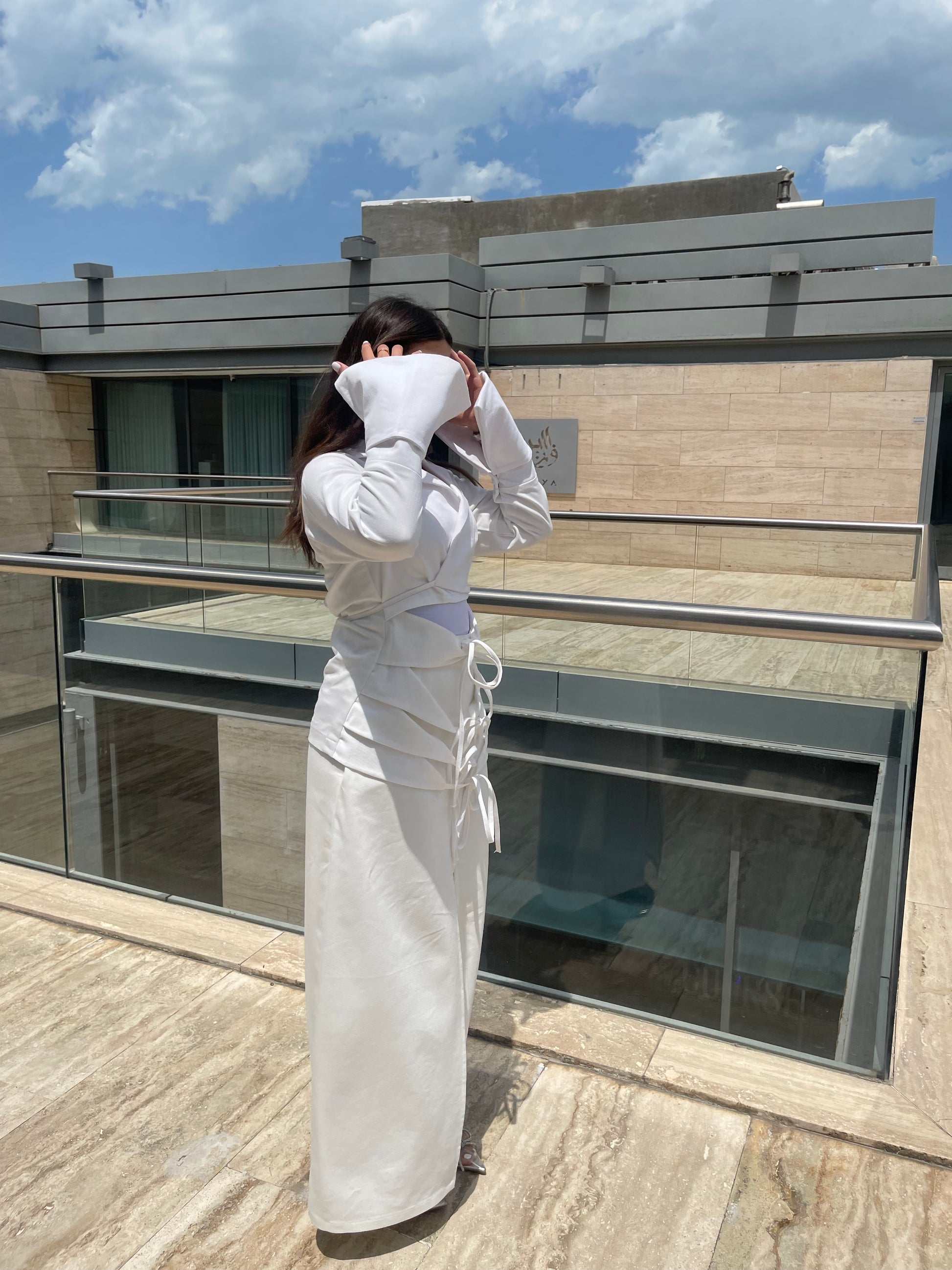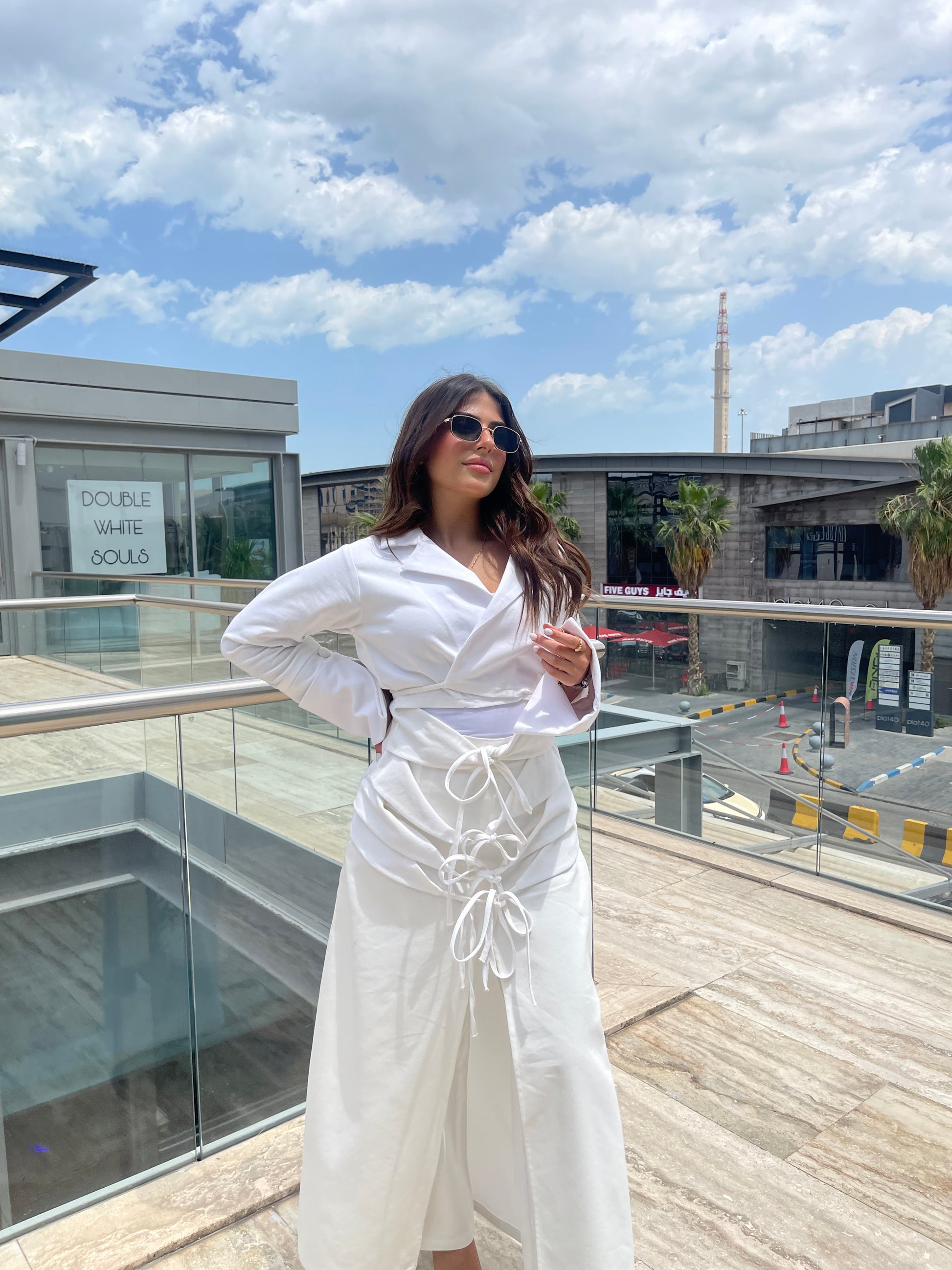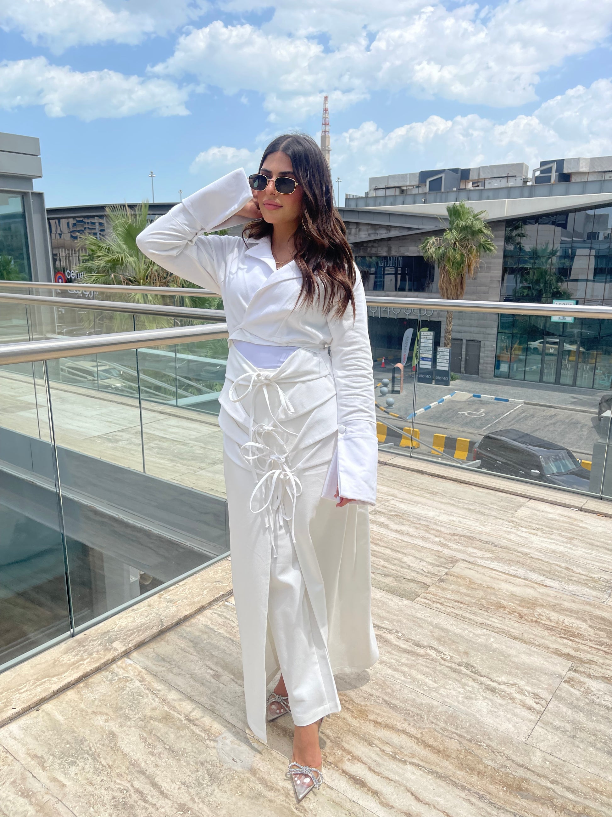 A structured top with tie details length is fixed, styled with skirted pants length is 41 inch.