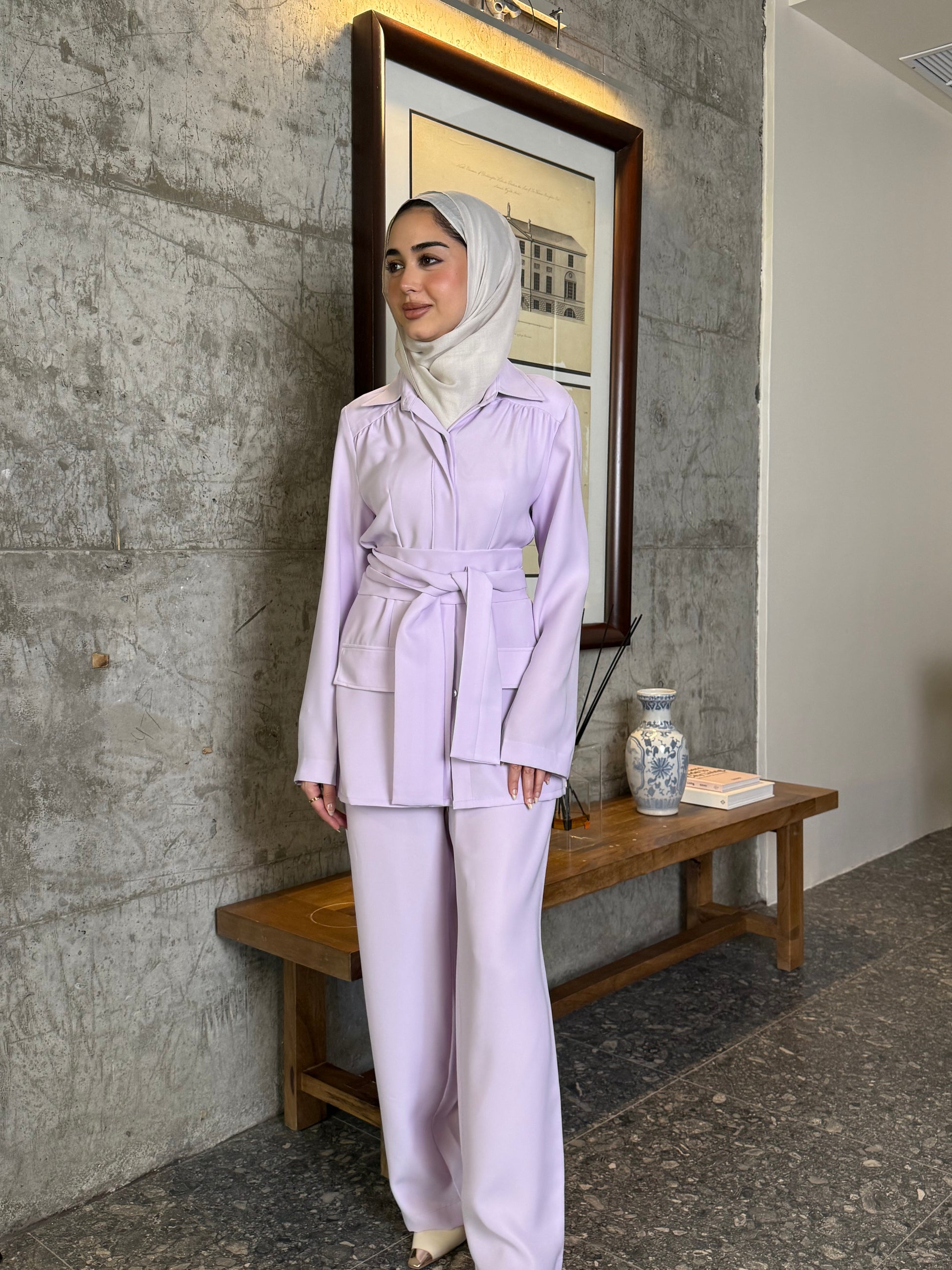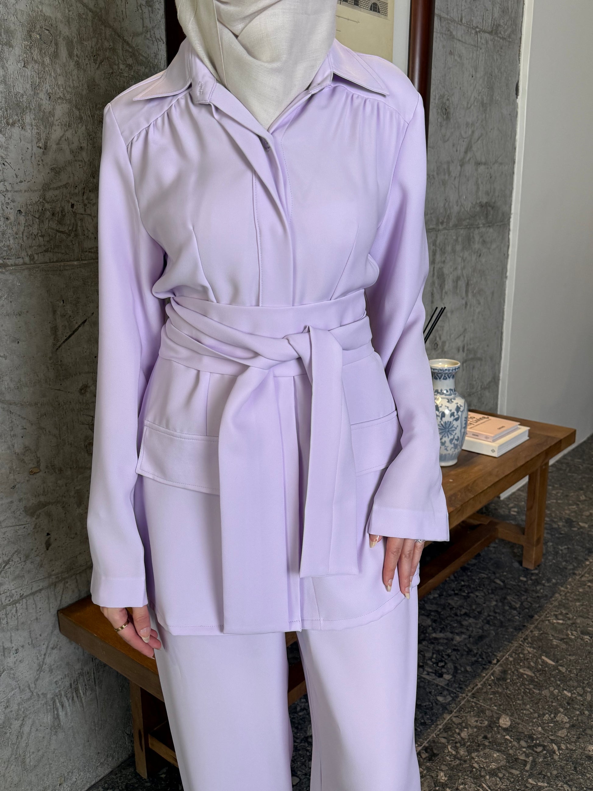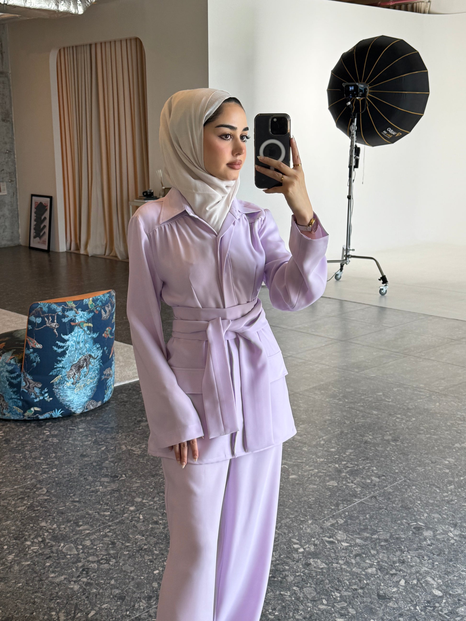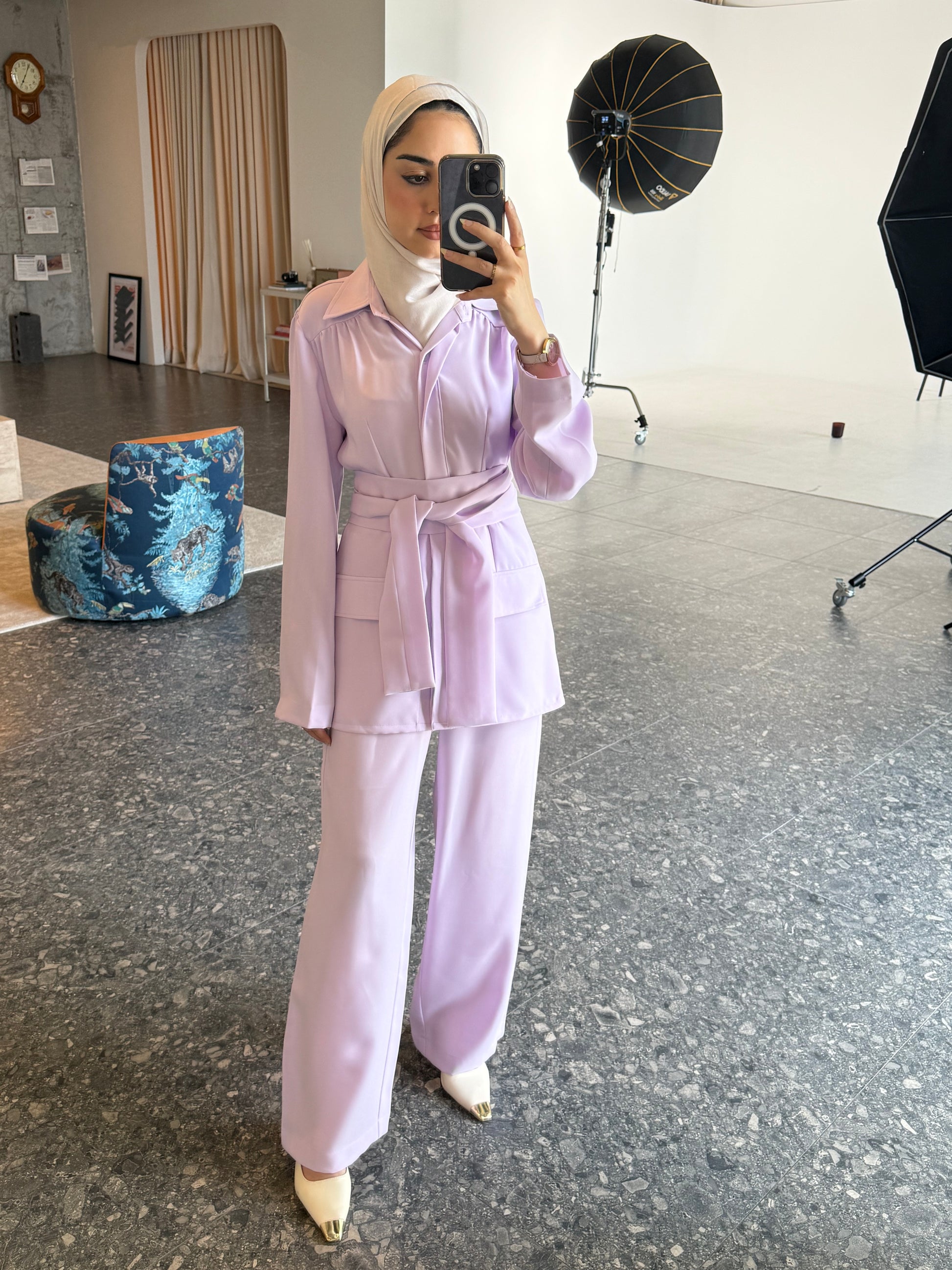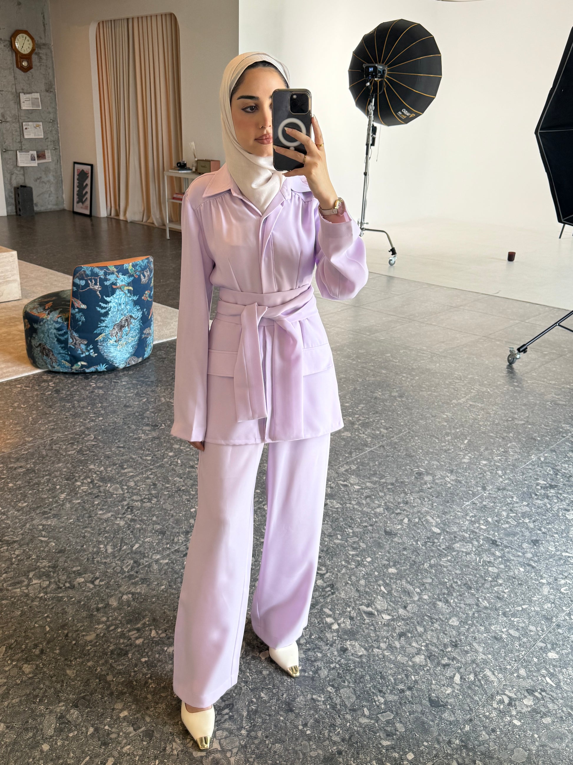 A muted lilac three-piece set featuring a buttoned up shirt with a matching belt and pants. Elevated, effortless, and made to suit every occasion.