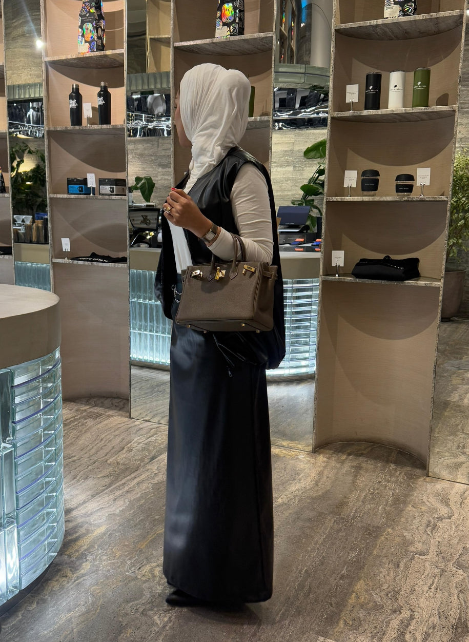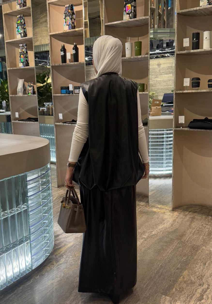 A two-piece set featuring a leather vest paired with a matching leather skirt. Sleek, versatile and made to elevate your looks.
