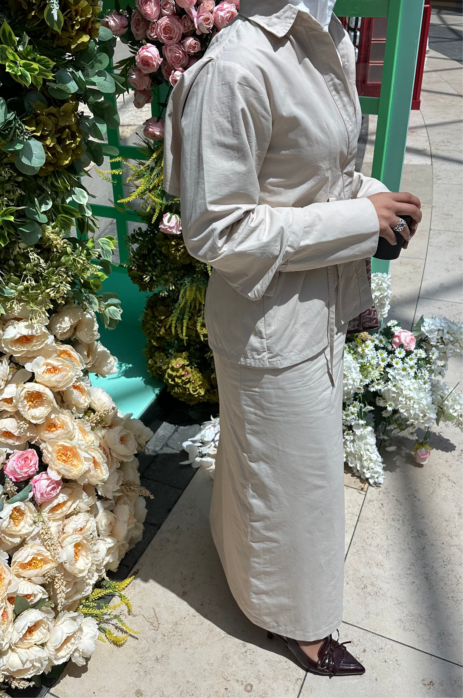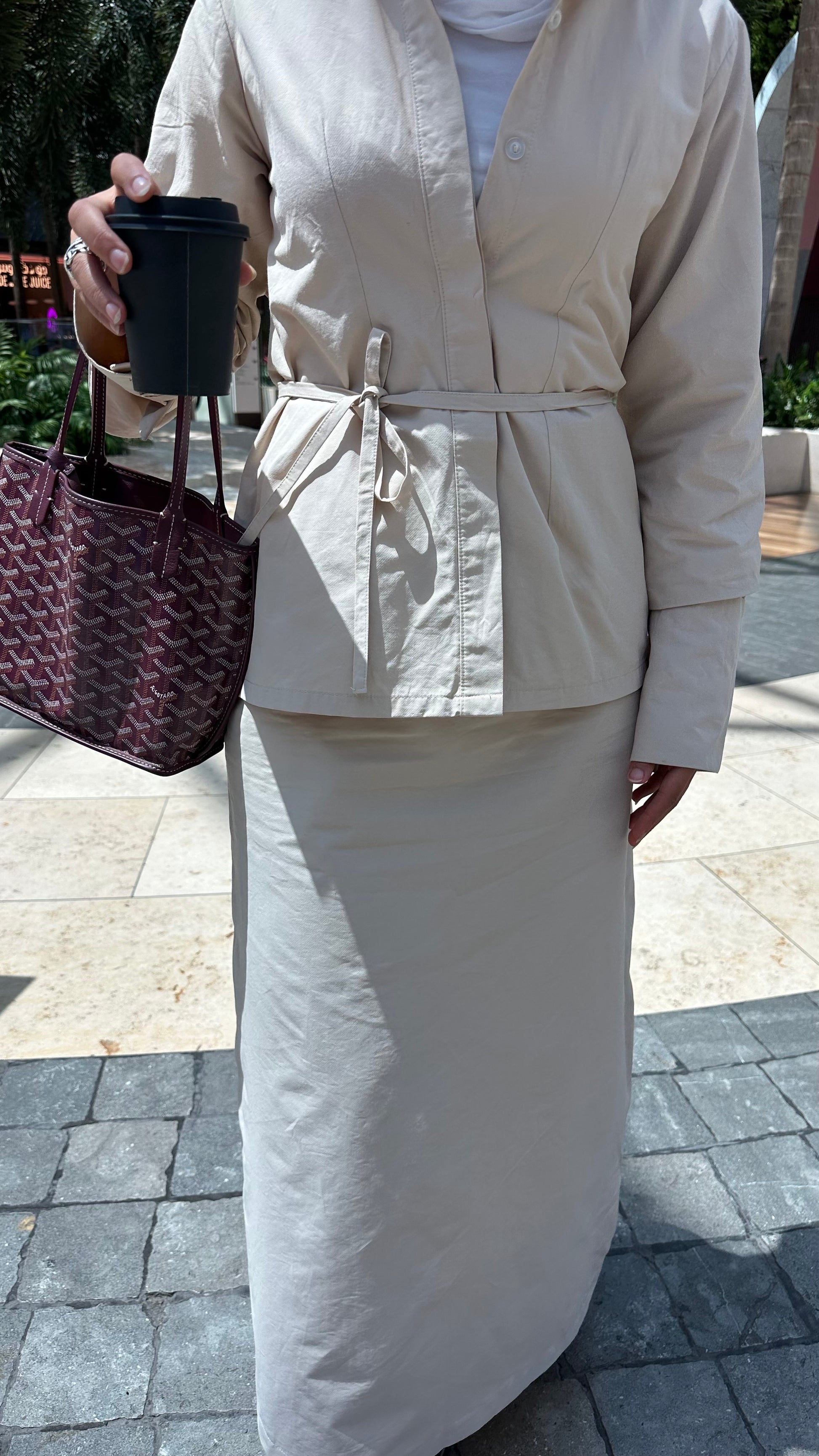 Shirt with ruffled back shirt length 27 inch, adjustable tie, and double sleeve detail. paired with matching skirt.