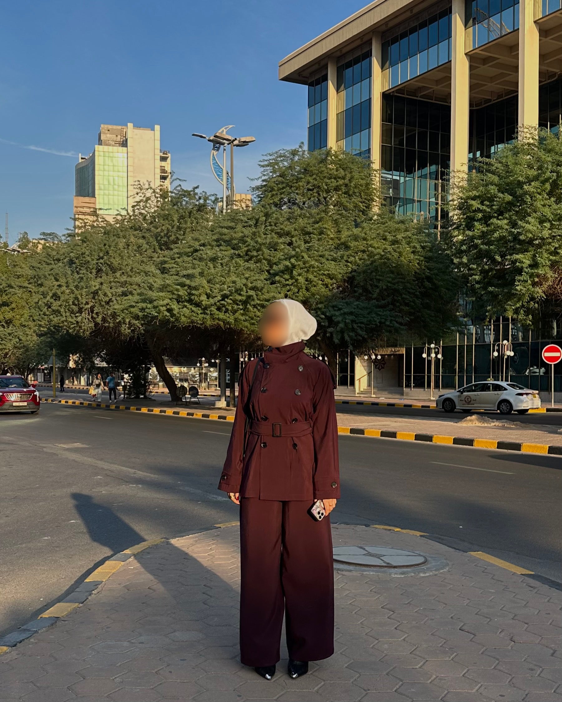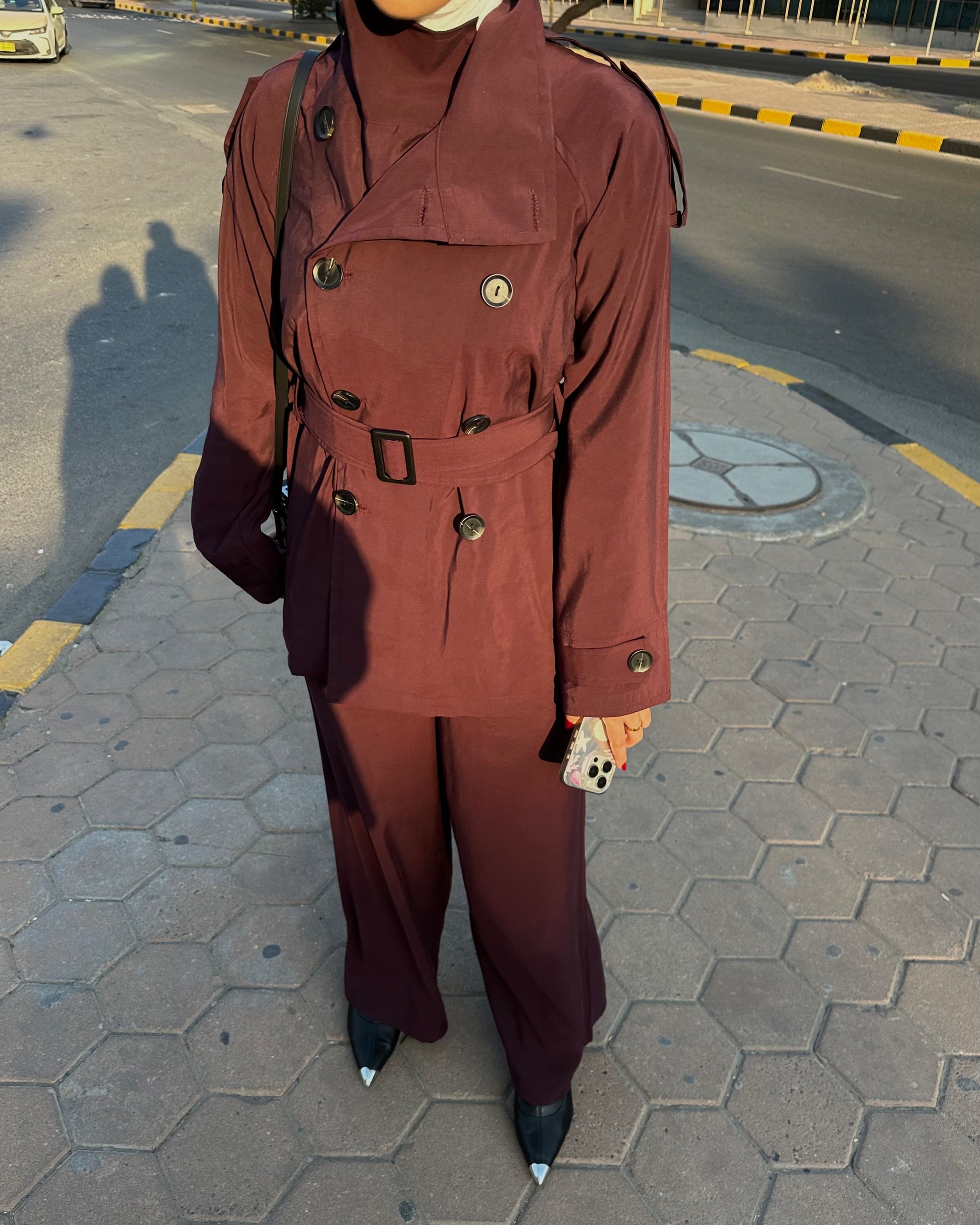 High collar double breasted buttons trench coat with a belt and a matching pants .