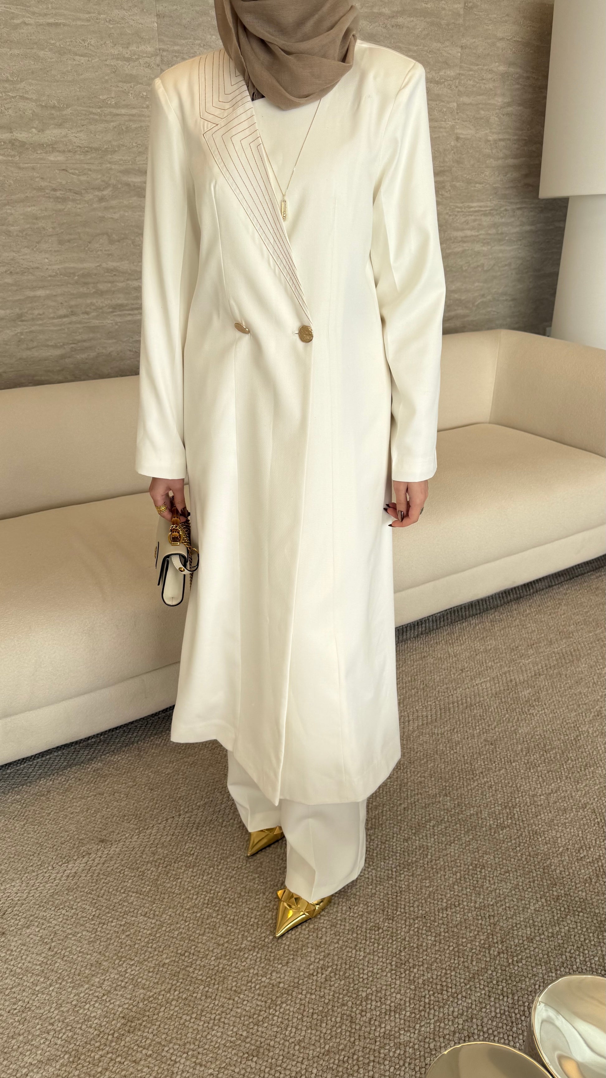 A tailored and fully lined long coat, detailed with precise stitching and bold gold buttons. Measures 48 inches in length.