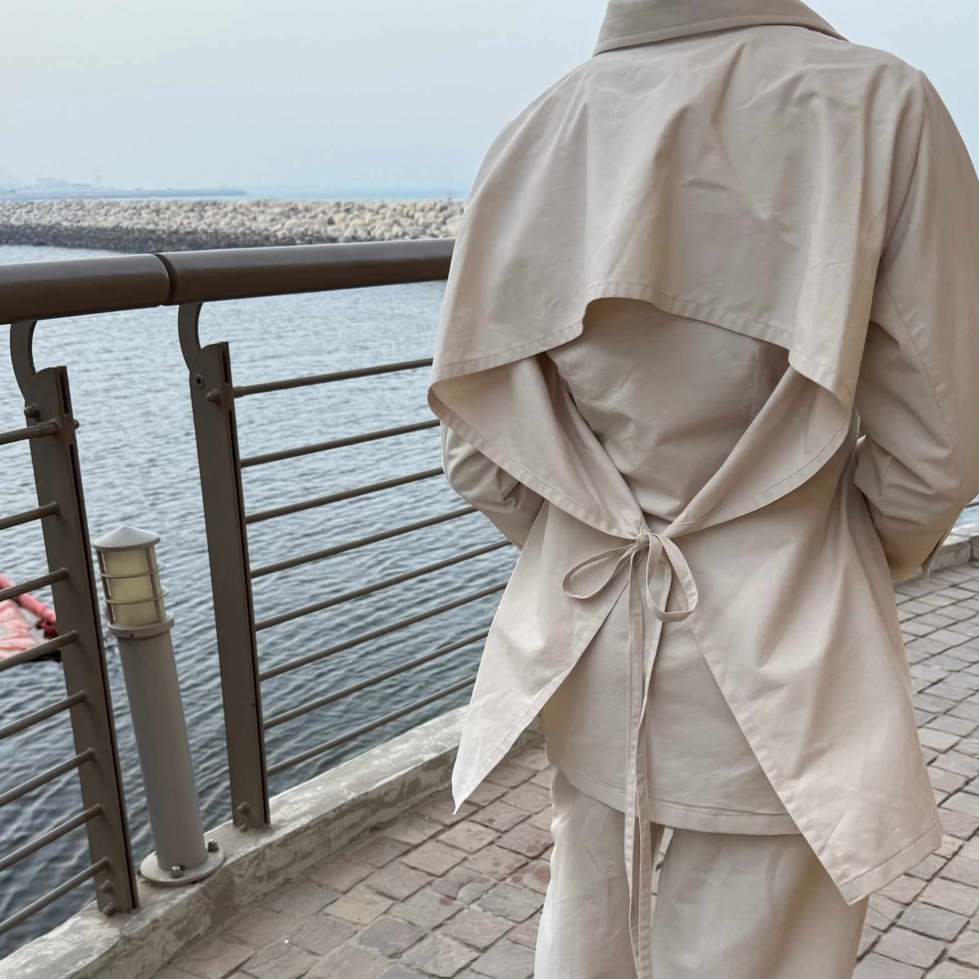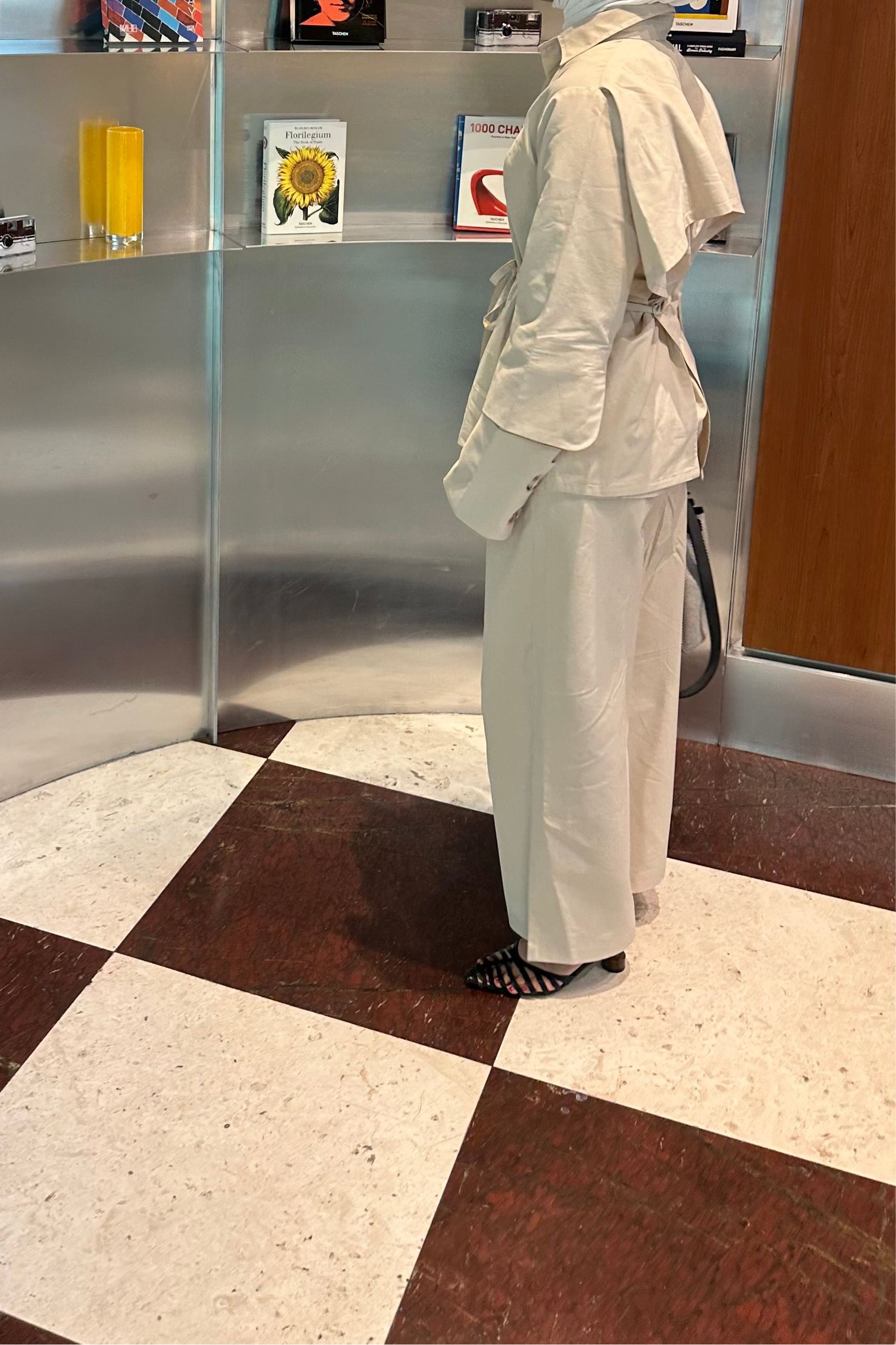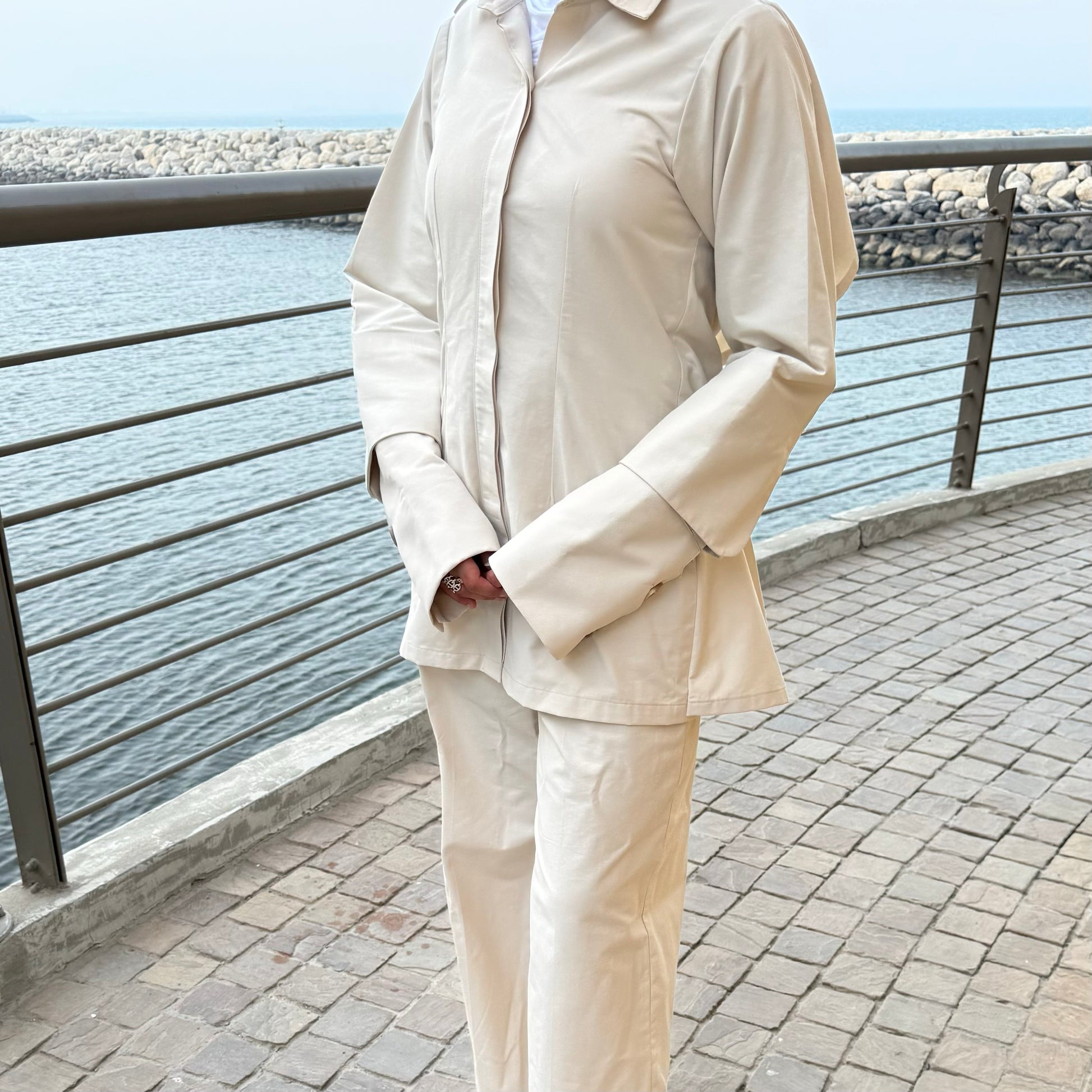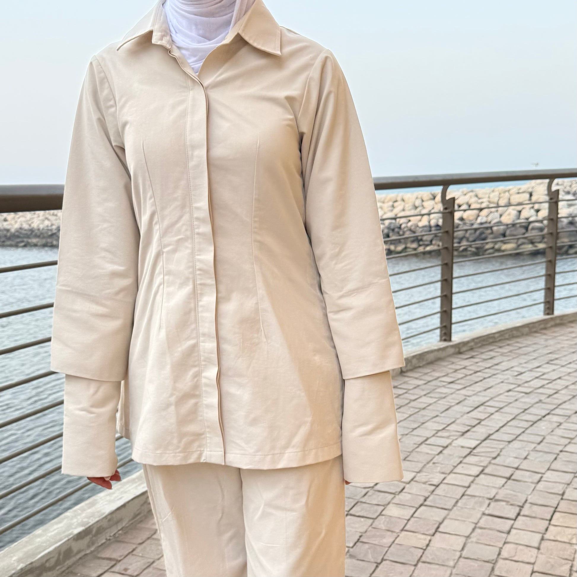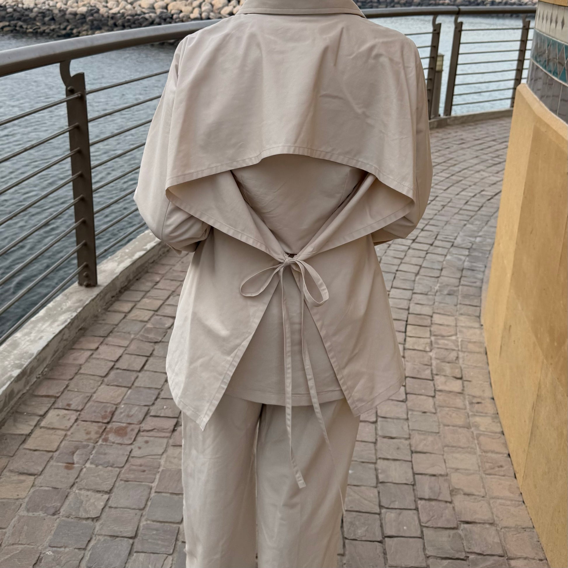 Shirt with ruffled back, adjustable tie, and double sleeve detail. 27-inch length, paired with matching pants 40-inch.