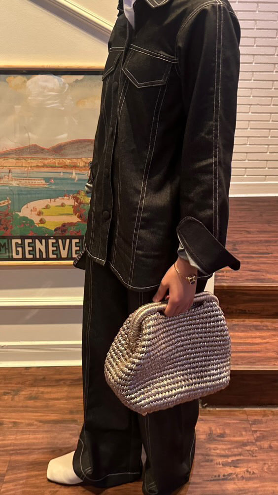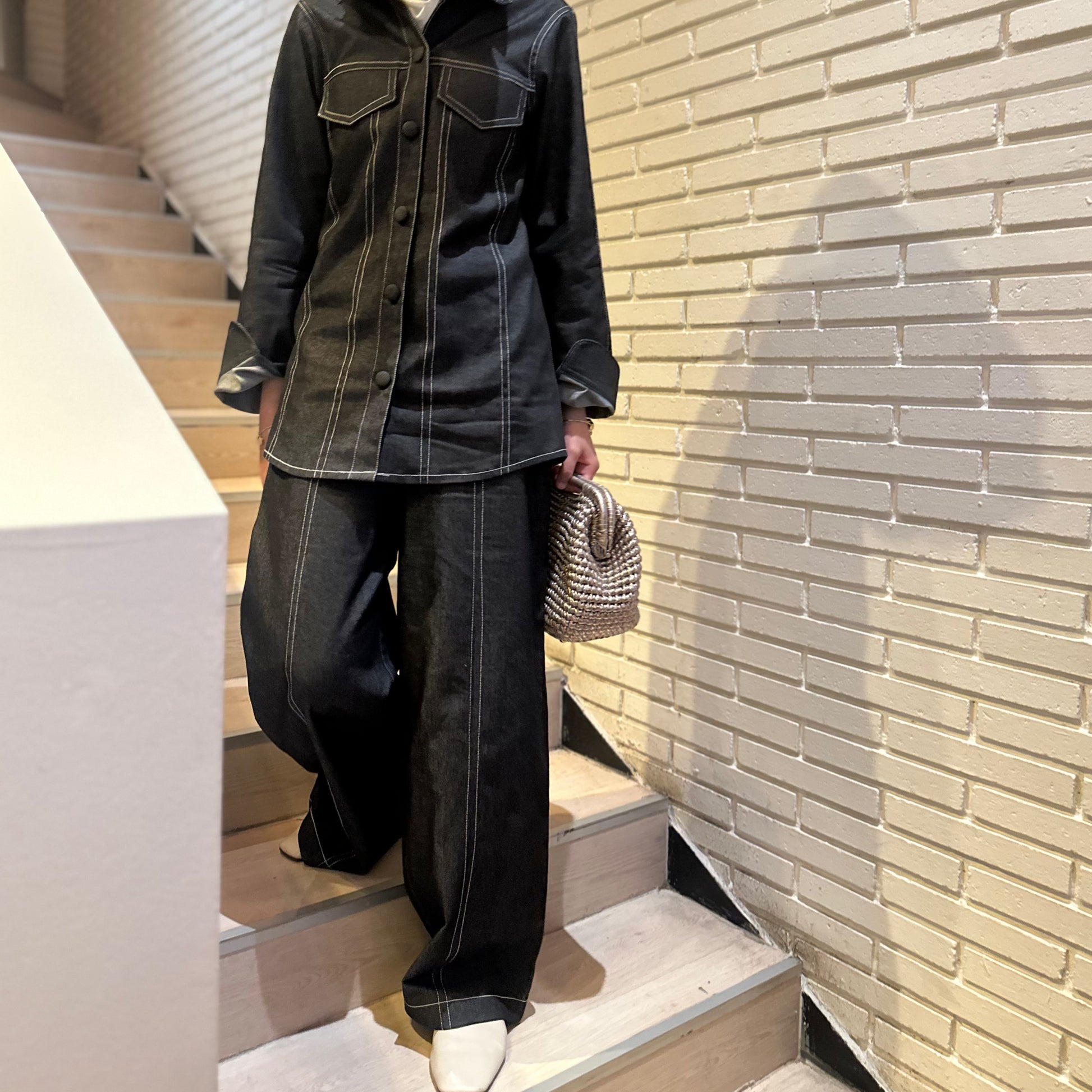 This two-piece set includes a tailored long-sleeve jacket with contrast stitching, paired with matching high-waisted pants measuring 41 inches in length.